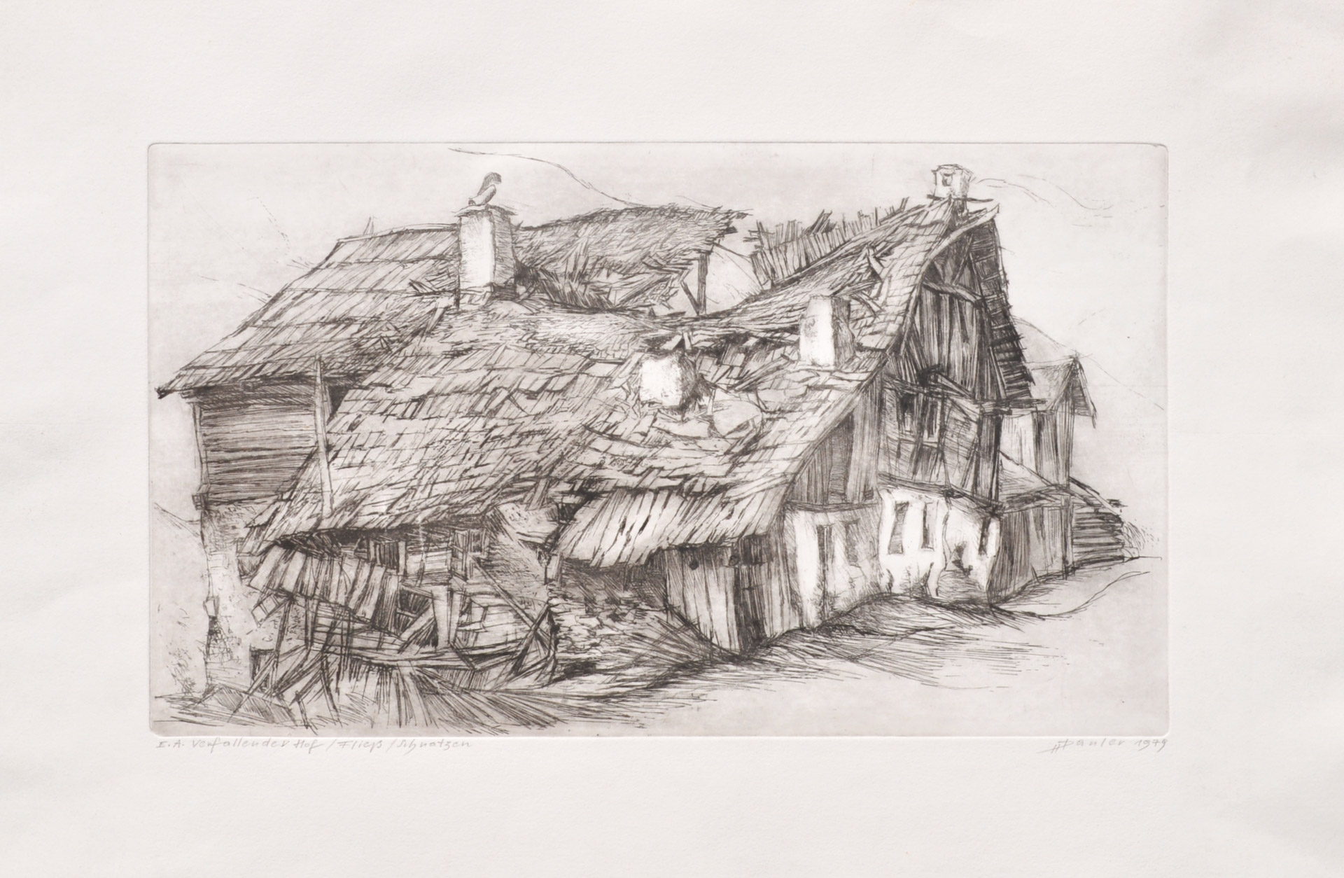 Herbert Danler (Fulpmes 1928 - Telfes im Stubaital 2011) Cortile in rovina, Fließ/Schnatzen, 1979;Acquaforte, 20 x 34 cm (lastra), 36,5 x 51,7 cm (foglio)