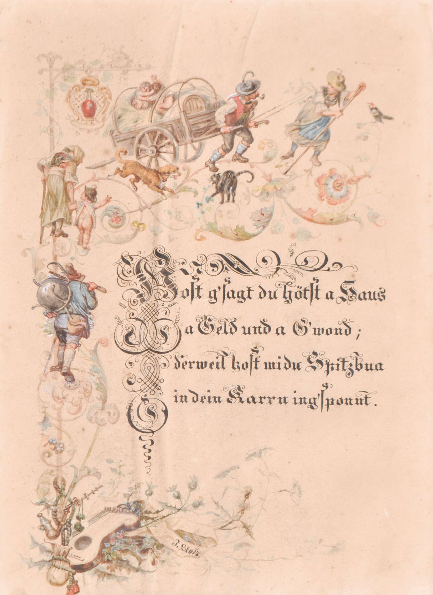 Ignaz Stolz d. Ä./il vecchio (Tramin/Termeno 1840 - Bozen/Bolzano 1907) A Haus, a Geld und a Gwand;Acquerello, 43 x 31,5 cm, in cornice