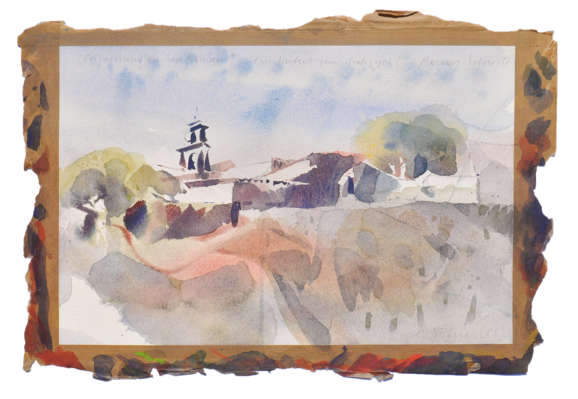 Reiner Schiestl (Kufstein 1939, lebt in Innsbruck/vive a Innsbruck) Memoria di San Roman (Spagna), 1983;Acquerello, 34,5 x 53 cm, cornice in carta