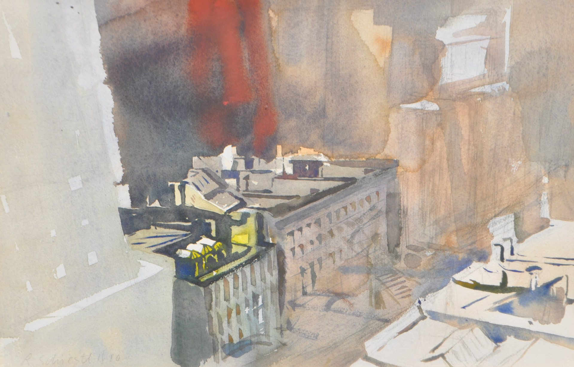 Reiner Schiestl (Kufstein 1939, lebt in Innsbruck/vive a Innsbruck) Gola di case, 1980;Acquerello, 34,5 x 53 cm, in cornice