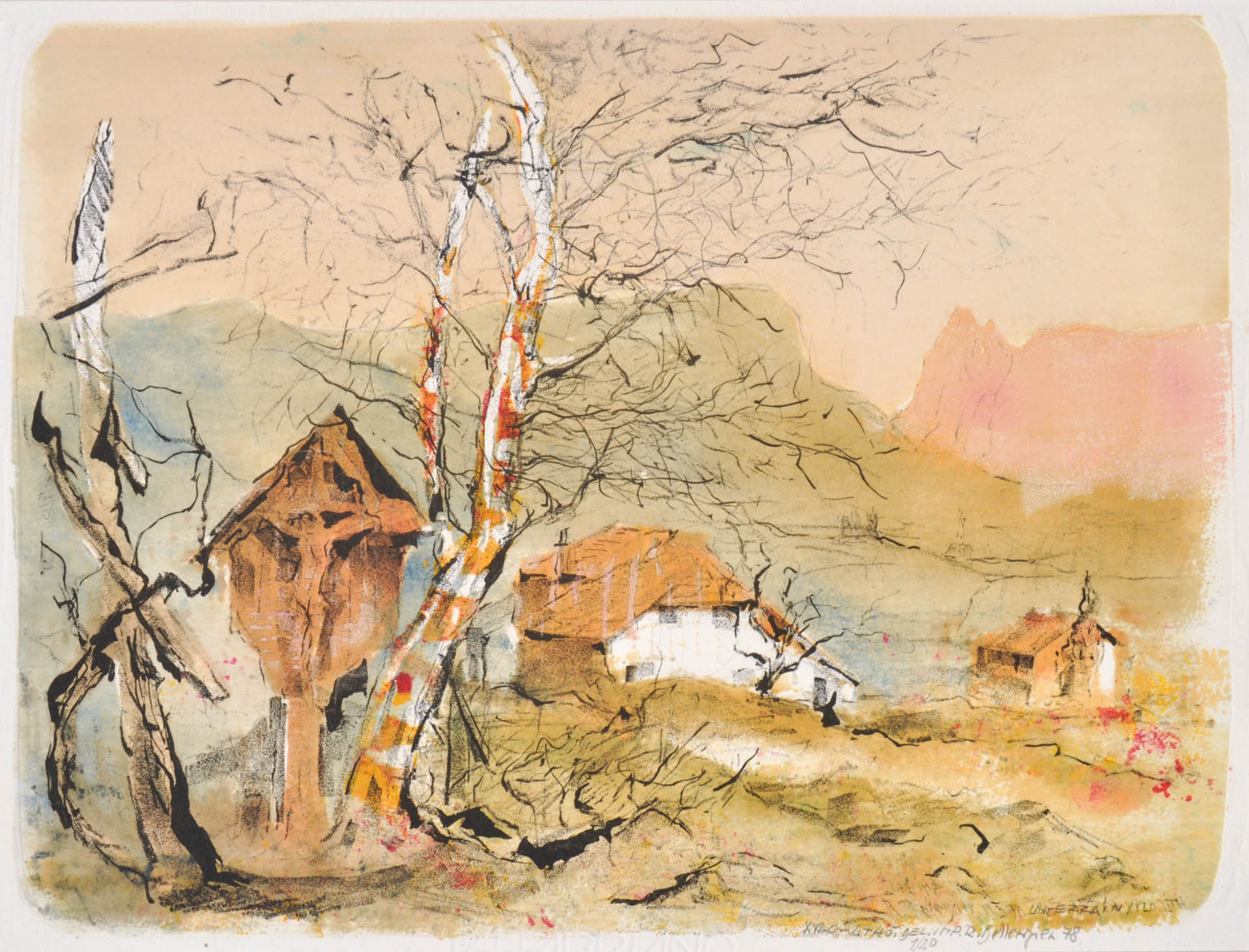Rudolf Bellenzier (Tötschling, Brixen/Bressanone 1922 - Meran/Merano 1990) Riva di Sotto con Sciliar, 1978;Xilolitografia, 30 x 39,5 cm (lastra)