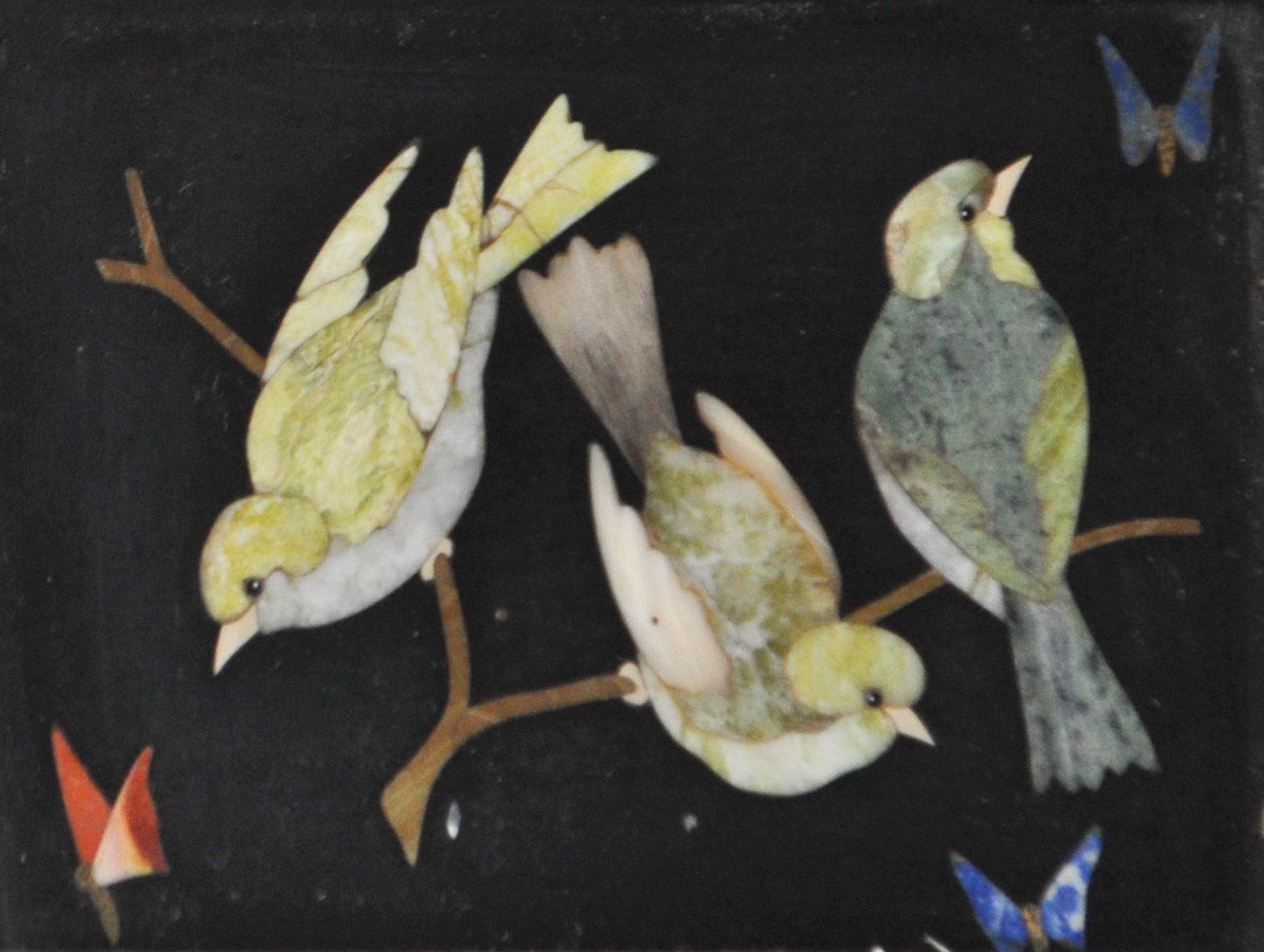 Anonym/anonimo Opera in pietra dura "Tre uccelli su un ramo con farfalle", Italia, XIX/XX sec;
