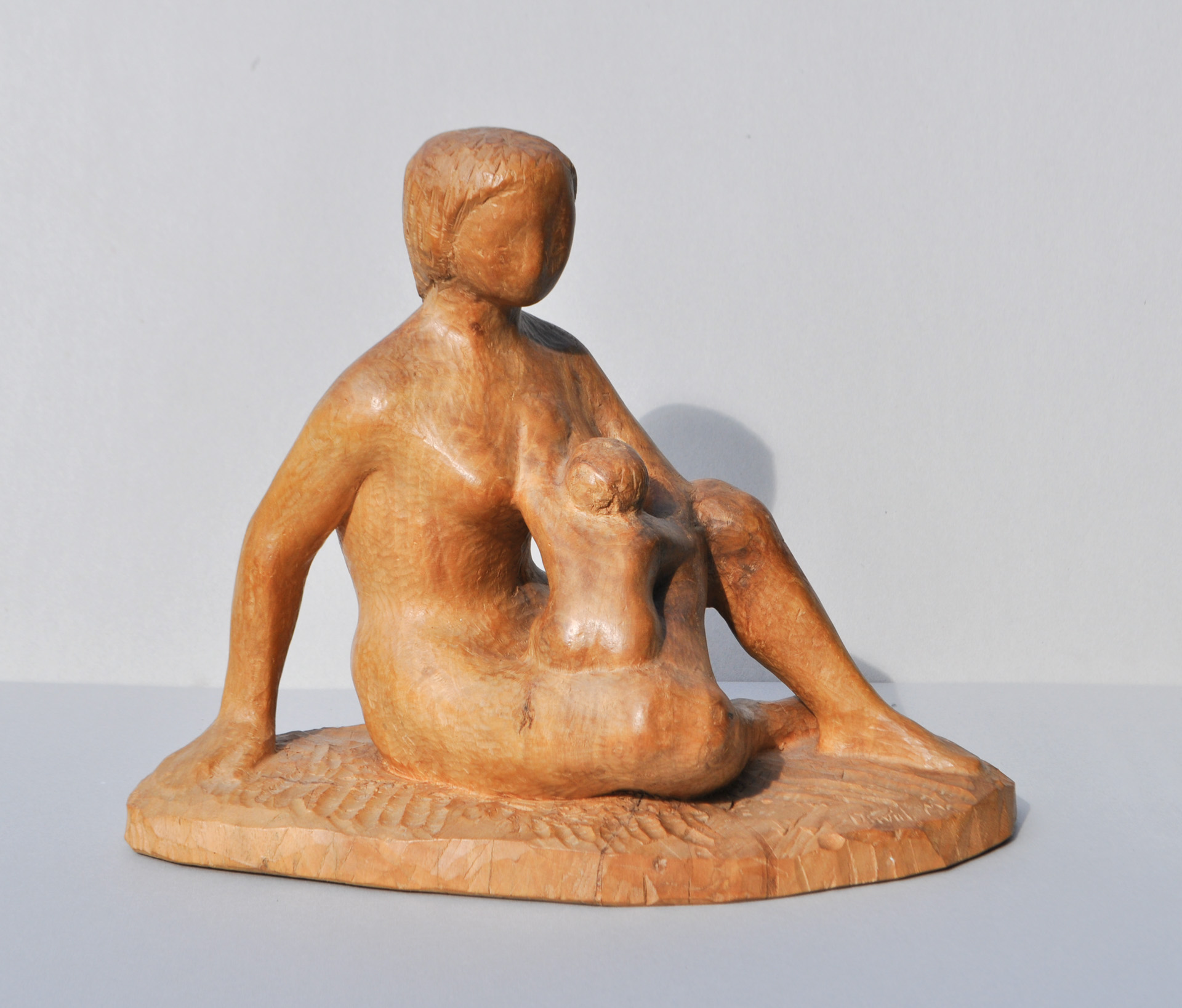David Moroder (St. Ulrich in Gröden/Ortisei 1931 - 1997) Madre che allatta;Legno, alt. 33 cm, largh. 41 cm