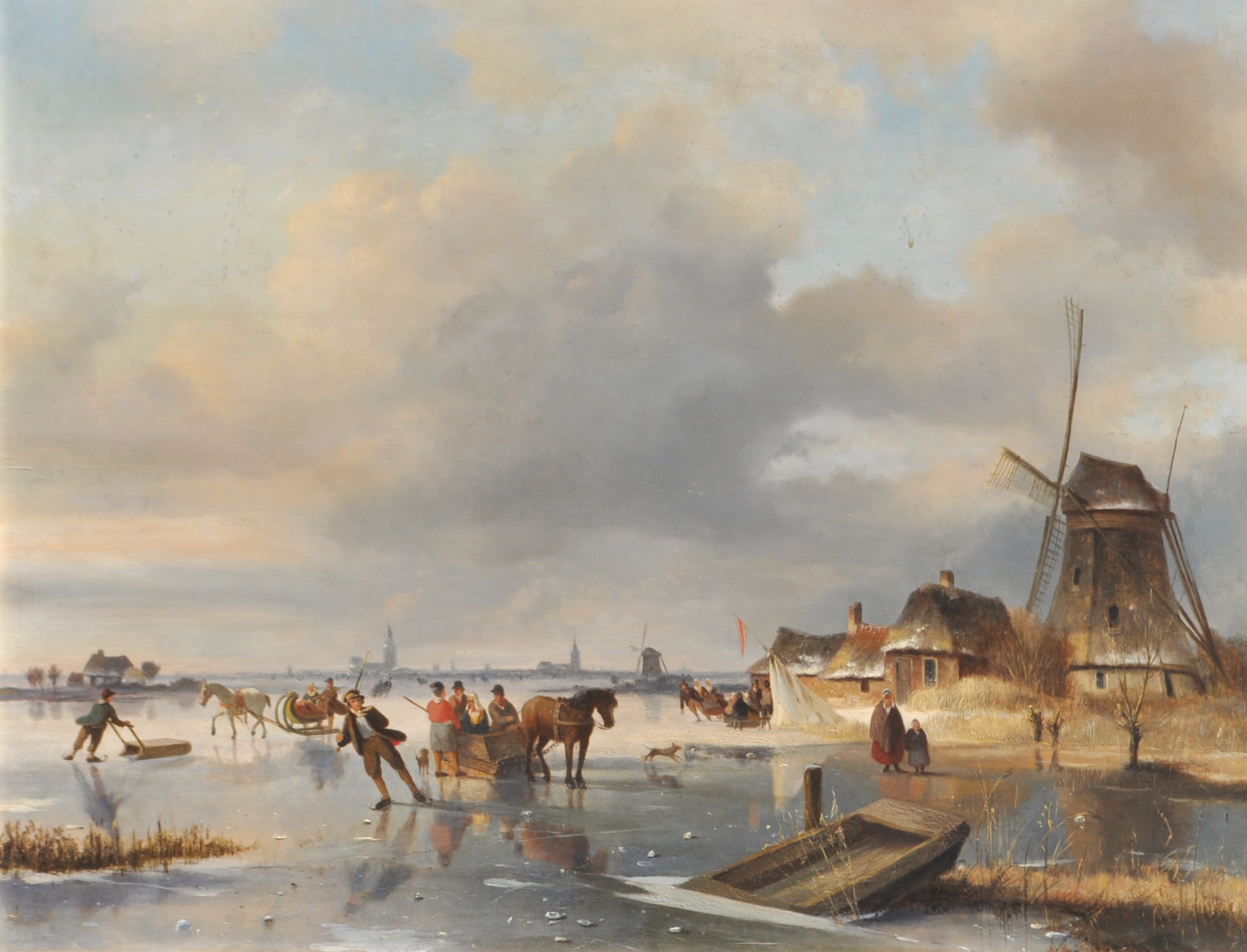 Niederländischer Maler, 19. Jh./Pittore olandese, XIX secolo (Verboeckhofen?) Winter Landschaft Paesaggio invernale;Öl auf Holz, 61 x 78,5 cm
