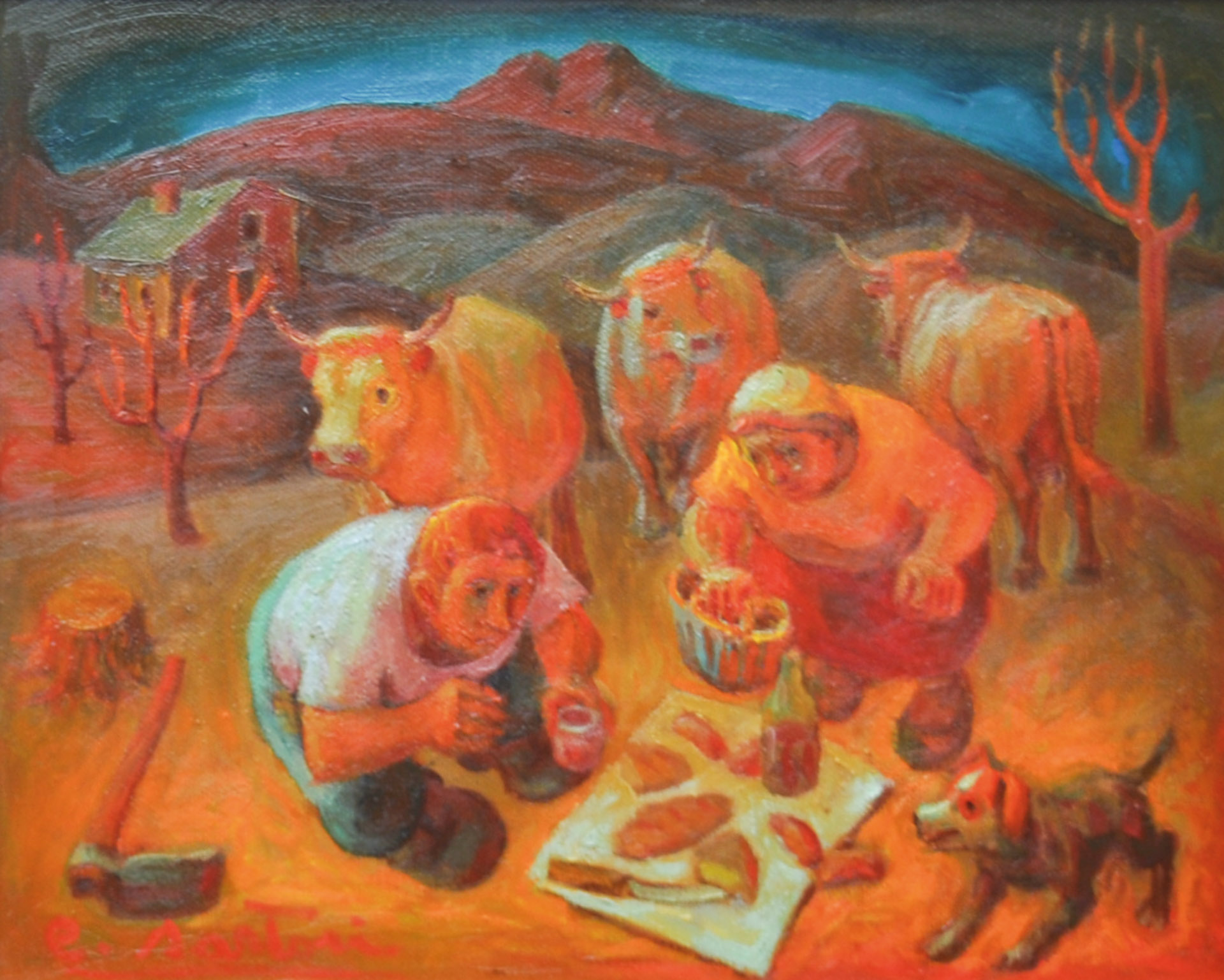 Carlo Sartori La merenda del contadino, 1997;Olio su tela, 24 x 30 cm, in cornice