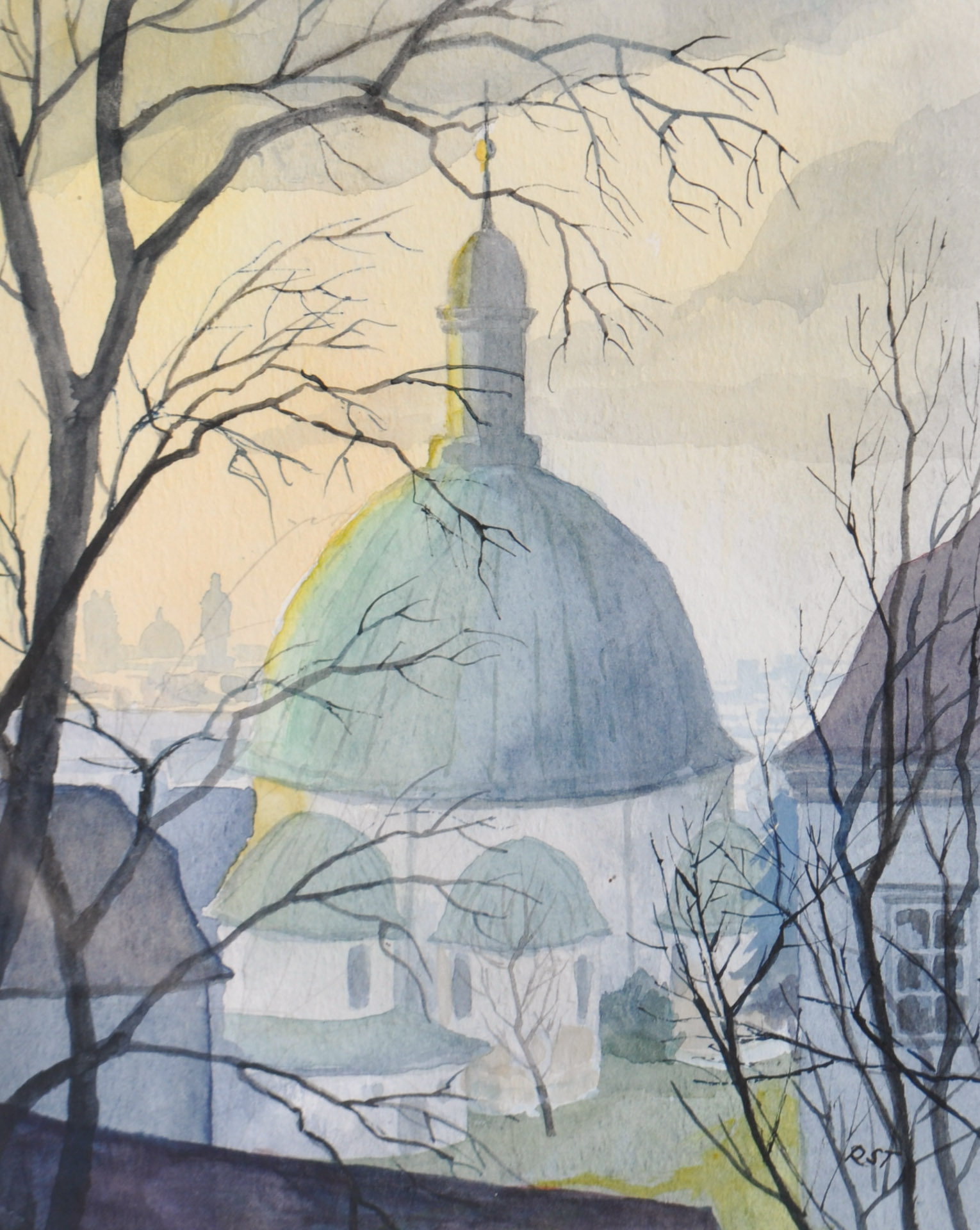 Reinhold Stecher (St. Valentin auf der Haide 1921 - Innsbruck) Chiesa Mariahilfkirche a Innsbruck;Acquerello, 29,5 x 23,5 cm, in cornice