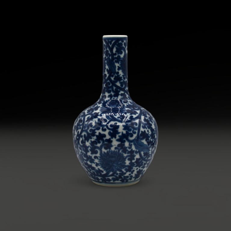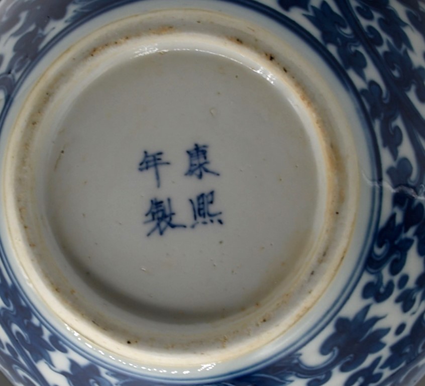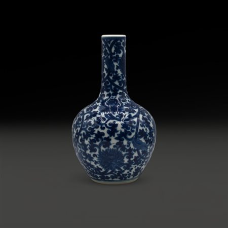 a fine Kangxi-style vase decorated in underglaze blue with lotus scroll. On the bottom seal mark of Kangxi.