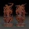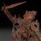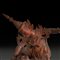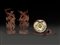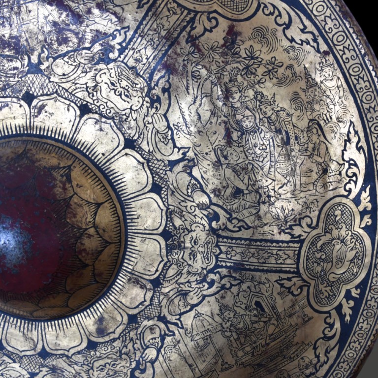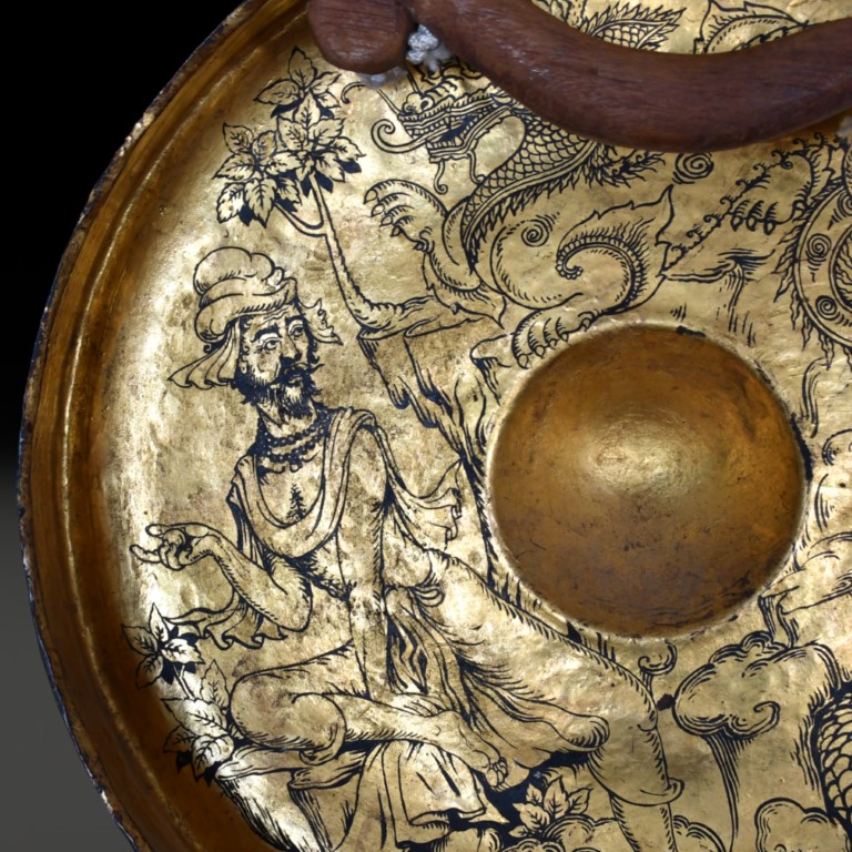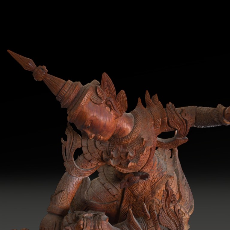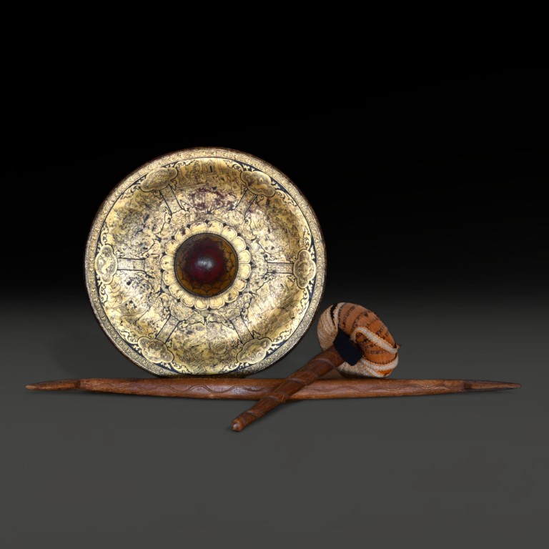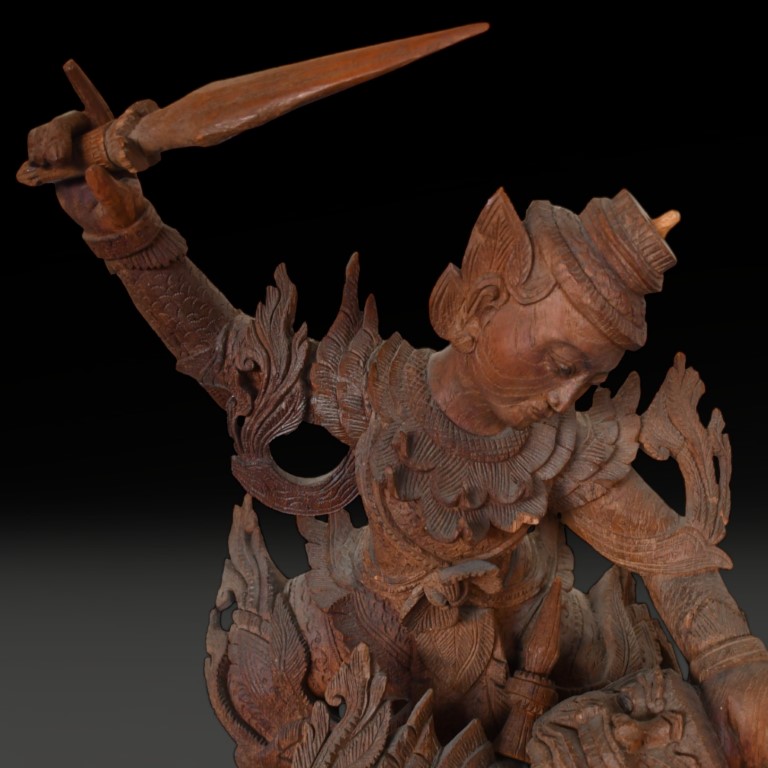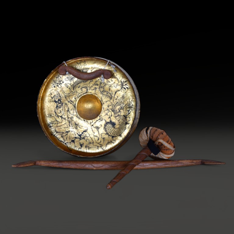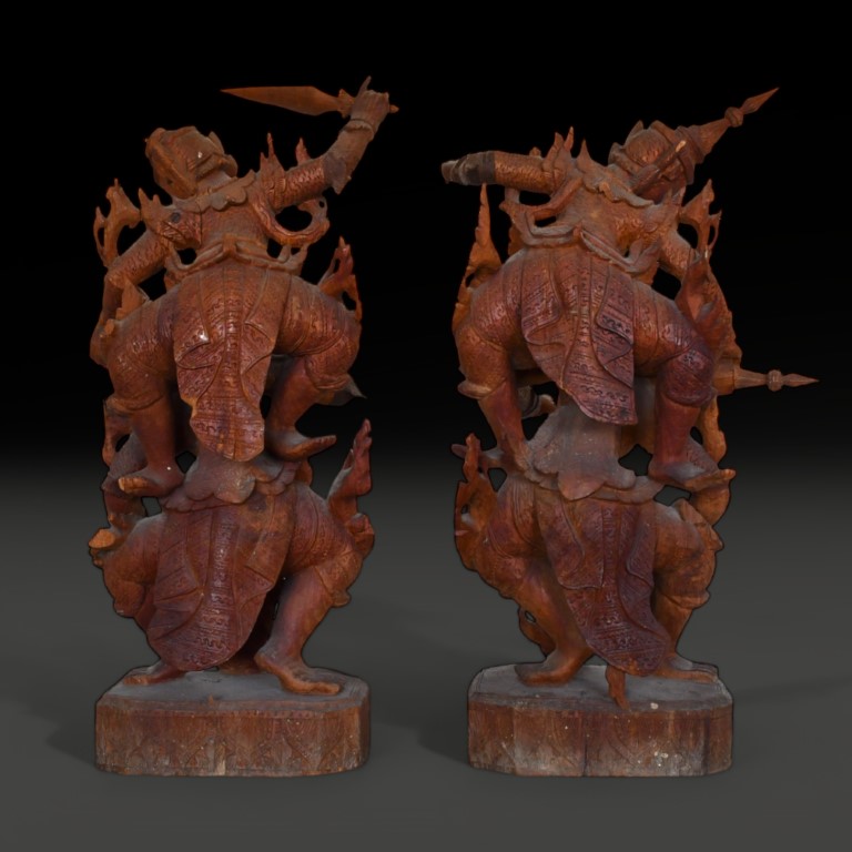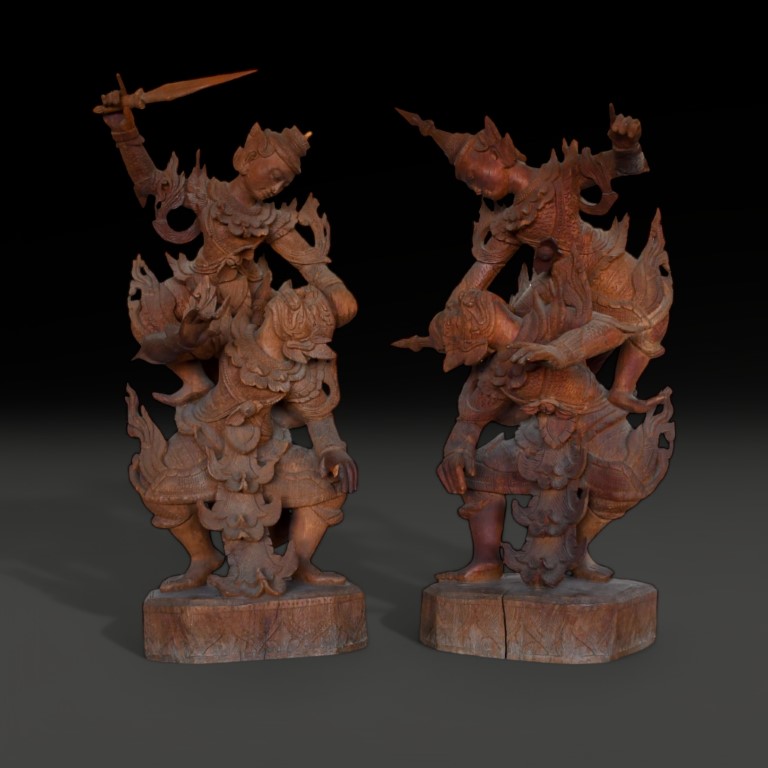 two wooden sculputures depicting scene from the burmese mithology and a parcel gilt bronze gong with its hammer.