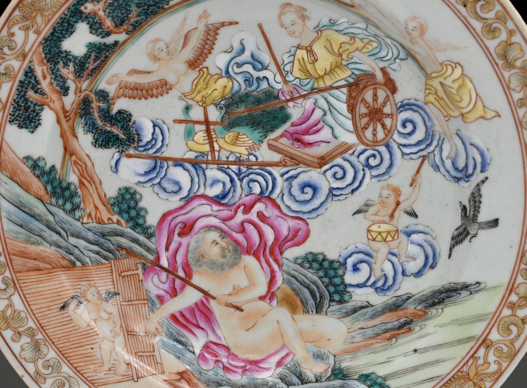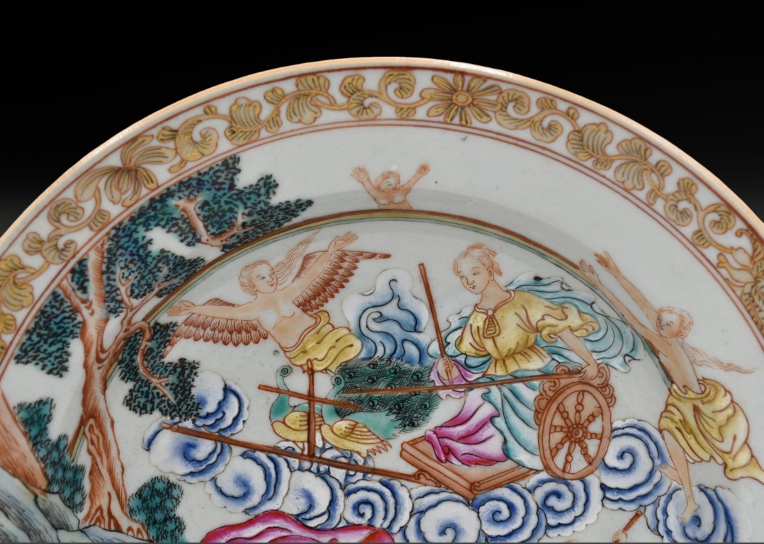 thin porcelain body decorated in Famille Rose with allegorical themes.