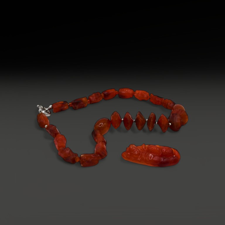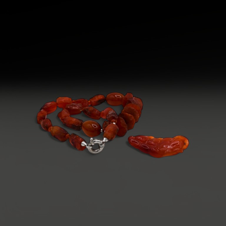 necklace with raw carnelian beads and a small carnelian carving depicting frog on lotus flowers.