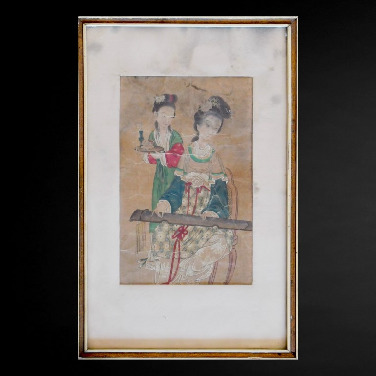 tempera on silk depiciting a court lady playing harpicord with her attendent.