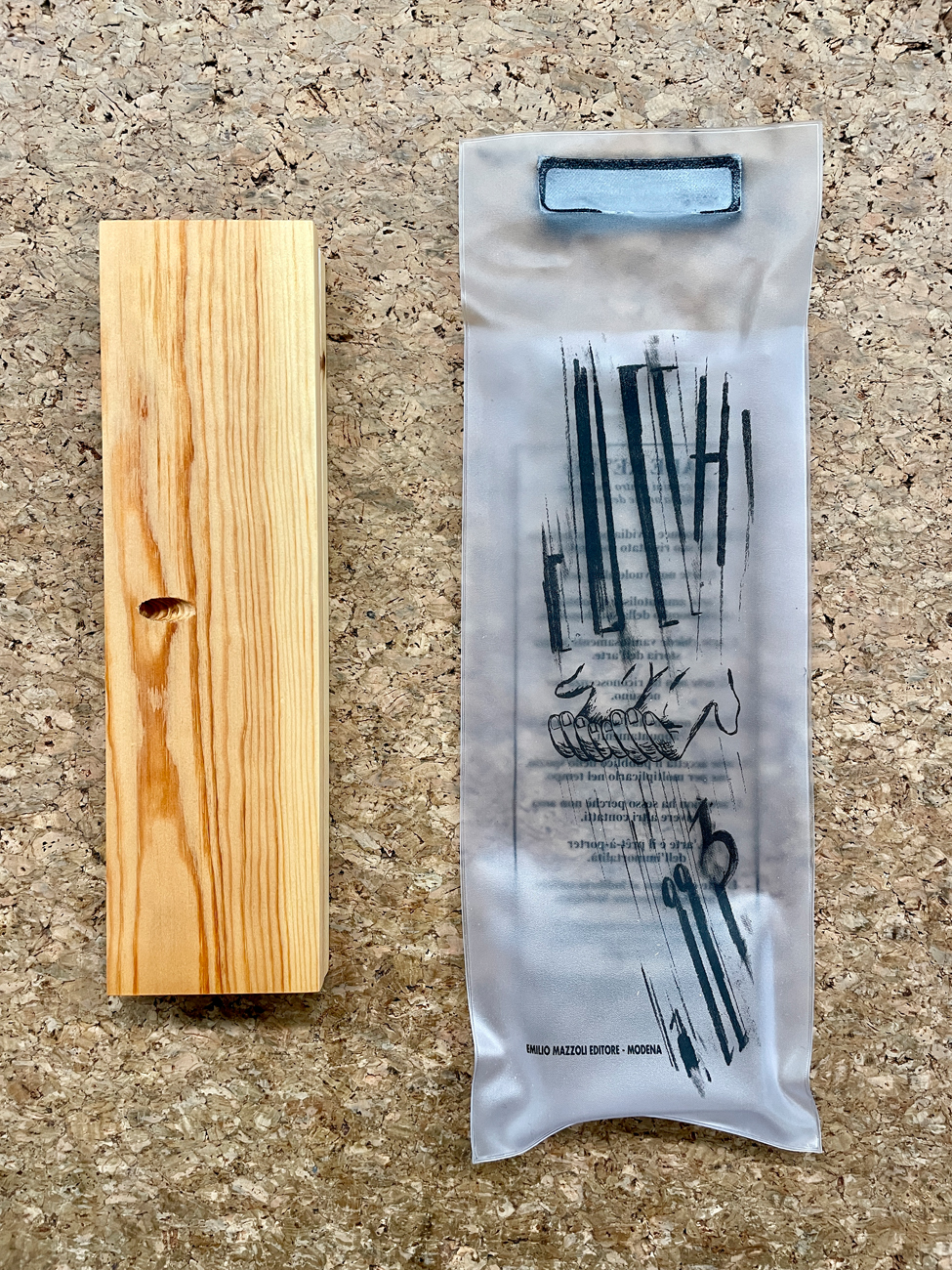 Entro plastica serigrafata protettiva originale recante al fronte illustrazioni dell'Artista e al retro testi di Achille Bonito Oliva
