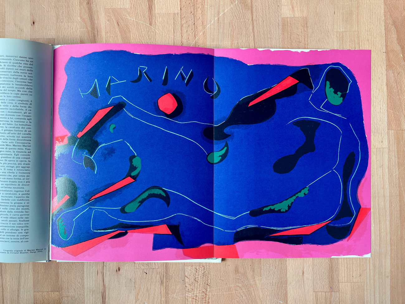 Catalogo riccamente illustrato, con 28 tavole a colori e 120 riproduzioni in bianco e nero, contenente una litografia originale a colori eseguita dall'autore appositamente per questo volume e stampata da Fernand Mourlot a Parigi nel 1974 (litografia pieghevole, recante firma in lastra, cm 31x48)