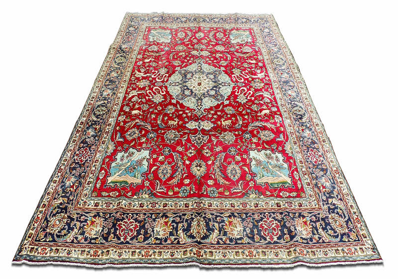 TAPPETO PERSIANO TABRIZ - PERSIAN TABRIZ RUG vecchia manifattura, fondo rosso, campo con motivi floreali, ai quattro angoli riserve sagomate con uccelli su rami fioriti, bordura nei toni del blu e del beige cm 390x305