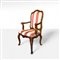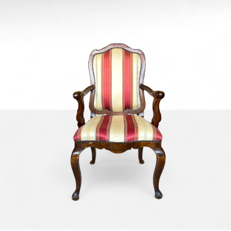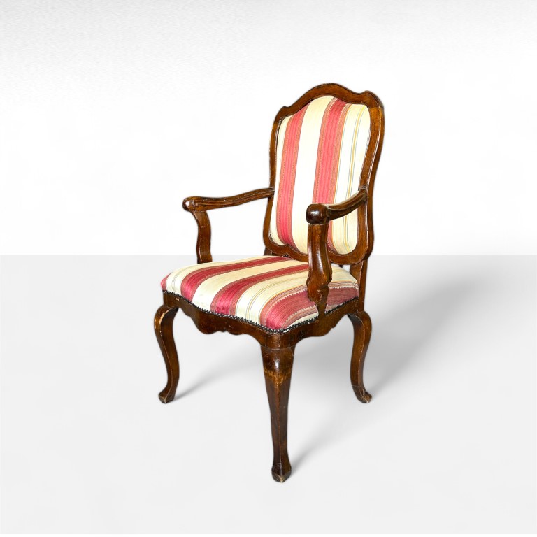 spalliera sagomata, braccioli a giorno, gambe mosse, ricoperta in tessuto a righe
