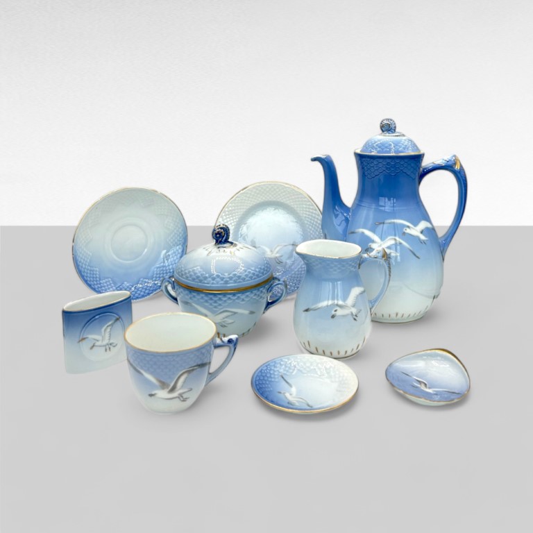 decorato con gabbiani e composto da: Una caffettiera, sei tazzine con piatto, una lattiera, un piattino piccolo, una zuccheriera, due piattini, dodici piattini da dolce e un altro oggetto