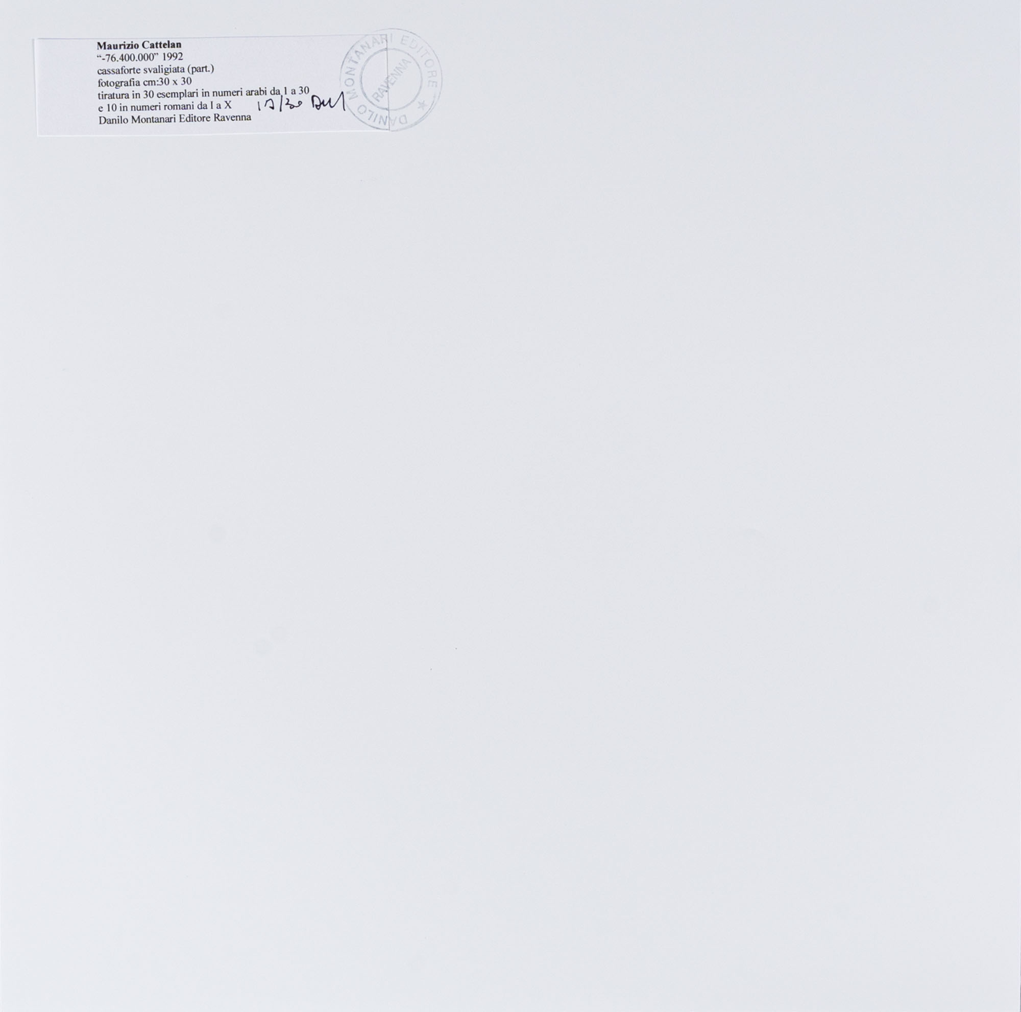 MAURIZIO CATTELAN(1960)Cassaforte svaligiata (part.) - 76.400.0001992Cartella contenente una stampa cibachrome, es. 17/30 su una tiratura complessiva di 30 esemplari in numeri arabi e 10 in numeri romani, Danilo Montanari Editore, RavennaDimensioni della cartella: 31 x 31 cmDimensioni della stampa cibachrome: 30 x 30 cmTimbro e firma Danilo Montanari Editore e numerazione al retro della stampa cibachromePROVENIENZA:Collezione privata, Milano