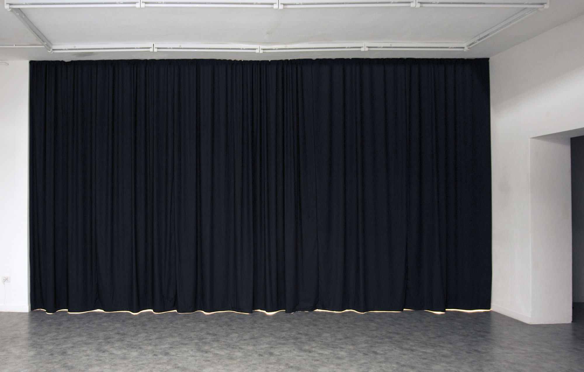 Installazione composta da ventole, lampade alogene con riflettore e tenda