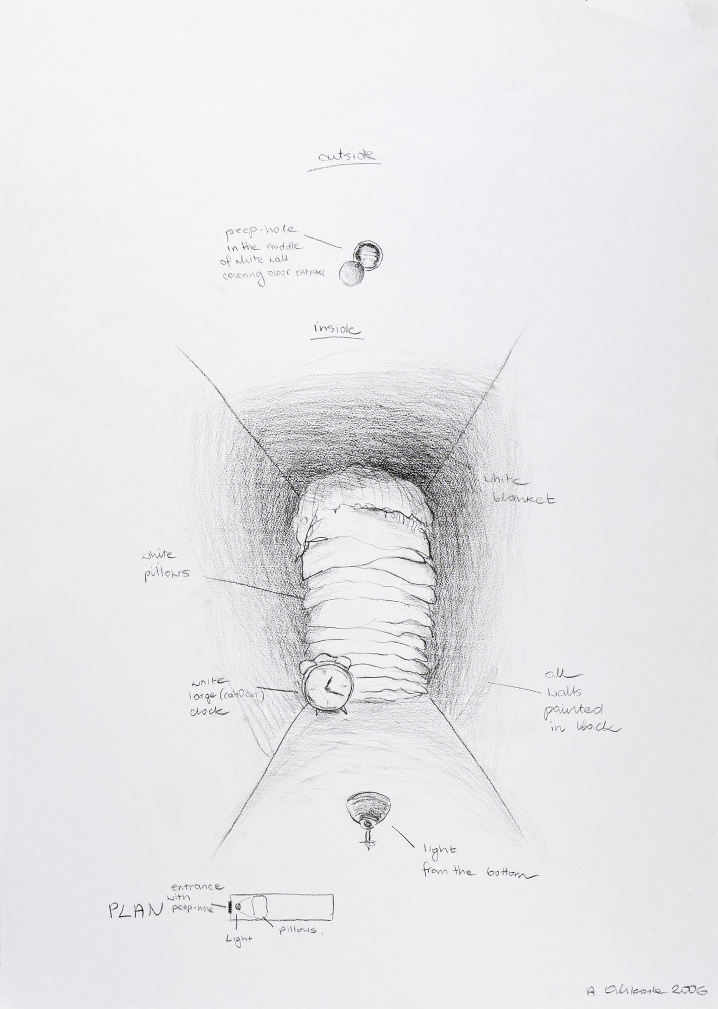 ANNA ORLIKOWSKA(1979)Still life 02Installazione composta da stanza in cartongesso con spioncino, cuscini e orologio L'installazione è accompagnata dal progetto realizzato con matita su cartaDimensioni variabiliDimensioni progetto: 70 x 50 cmIl progetto è firmato e datato 2006 in basso a destraOpera accompagnata da certificato di autenticità a cura della Galleria Federico Bianchi Contemporary Art, Milano e firmato dall'artistaPROVENIENZA:Collezione privata, MilanoESPOSIZIONI:14 ottobre - 14 Dicembre 200, Still life, Galleria Federico Bianchi Contemporray Art, Milano