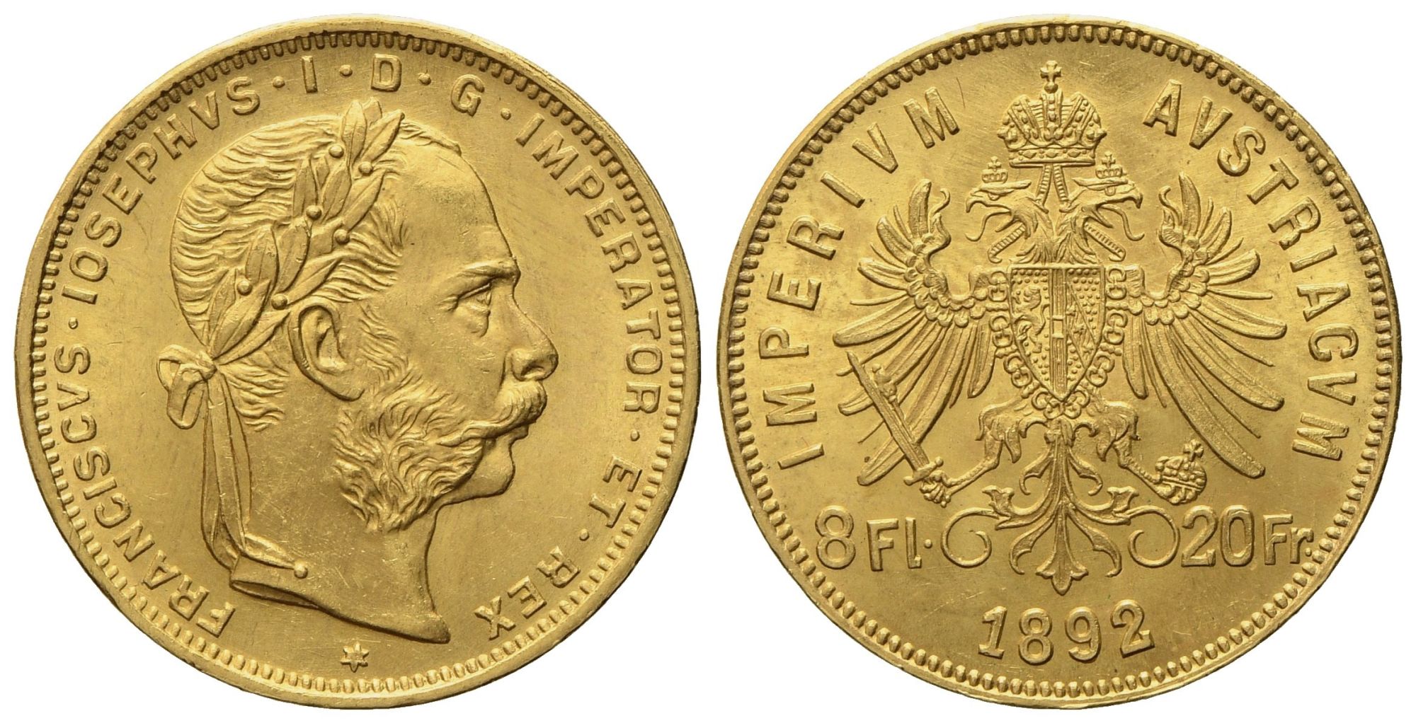 Lot 3 | AUSTRIA. Francesco Giuseppe (1848 - 1916). 8 fiorini 1892. Au (6,45 g; 20,8 mm)