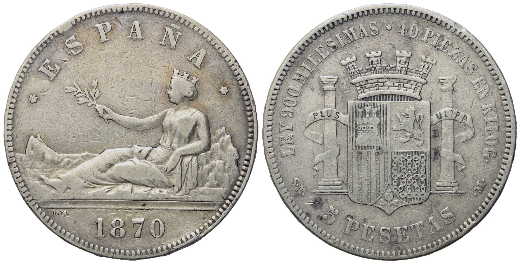 Lot 80 | SPAGNA. Governo provvisorio. 5 pesetas 1870. Ag (24,62 g; 37 mm)