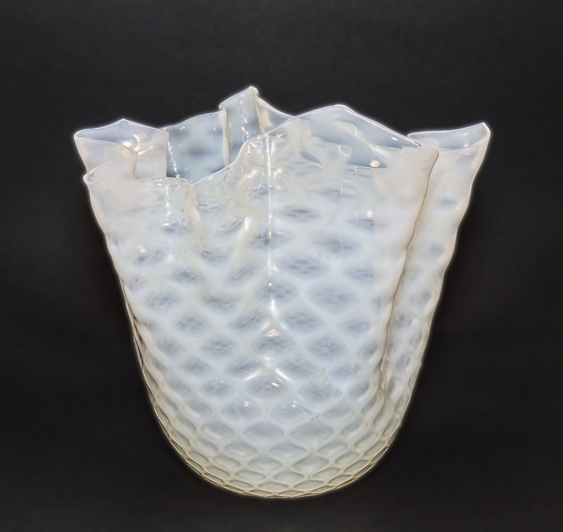 VASO A FAZZOLETTO IN VETRO SOFFIATO - BLOWN GLASS VASE Fulvio Bianconi per Venini, Murano, 1950 circa realizzato con motivo di reticolo binaco h cm 31