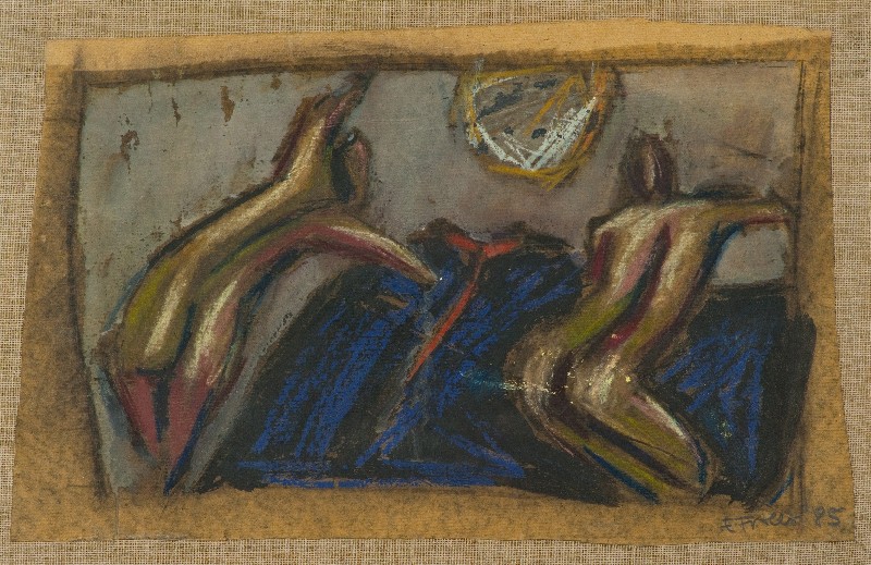 Elisabeth Frolet (Madagascar ) FIGURE, 1985 Tecnica mista su carta, cm. 34x56, applicata su tela di cm. 38x58 Firma e data in basso a destra.