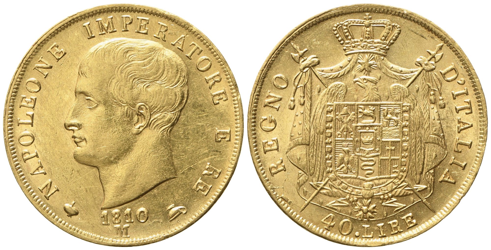 Milano. Regno d'Italia. Napoleone I (1805 - 1814). 40 Lire 1810. Puntali aguzzi. Au (12,94 g; 26,21 mm)