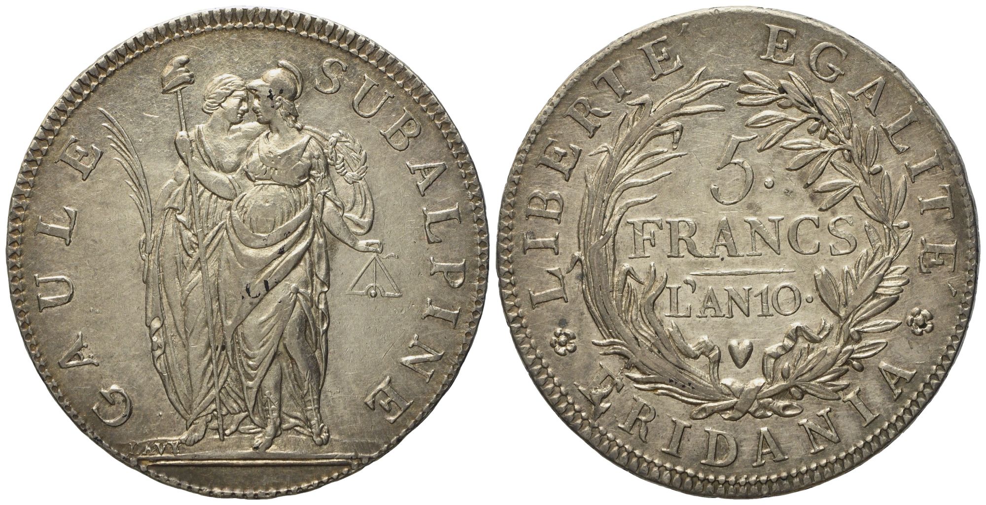 TORINO. Repubblica Subalpina (1800 - 1802). 5 franchi anno 10 (1802). Ag (24,93 g; 37,44 mm)