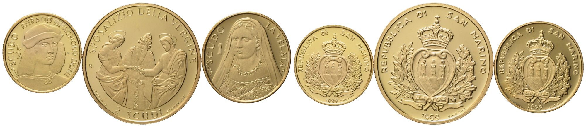 Lot 628 | SAN MARINO. 2, 1 e mezzo scudo 1999, trittico. Au 900 (11,28 g)