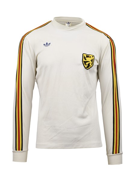 René VANDEREYCKEN. Maglia Nr.8 della Squadra Nazionale del Belgio indossata durante l'incontro amichevole contro l'Italia il 21 dicembre 1977 a Liegi. Vittoria degli Azzurri per 1-0 con un gol di Giancarlo Antognoni. Marca Adidas. Taglia 4x5. Maglia indossata. Belgian National Team jersey No.8 worn during the friendly match vs Italy on 21th December 1977 in Liege Victory for the Azzurri by 1-0 with a goal by Giancarlo Antognoni. Brand Adidas. Size 4x5. Match worn shirt.