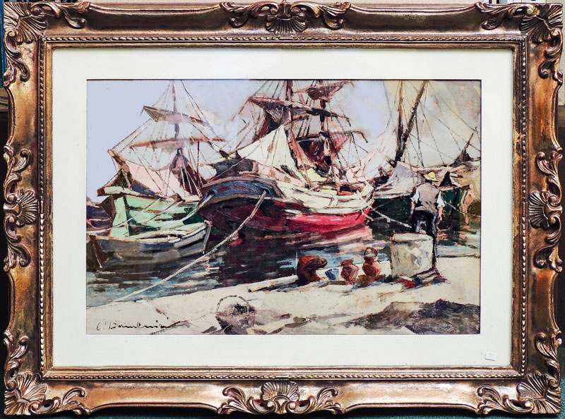 CARLO DOMENICI (1898-1981) AL PORTO DI LIVORNO - VIEW OF PORT OF LIVORNO OLIO SU tavoletta - oil on panel, firmato, al verso firmato e titolato, in cornice, cm 40x58