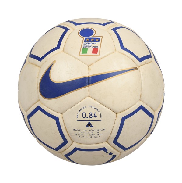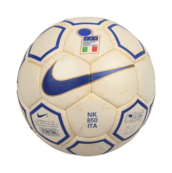 Italia - Moldavia. Pallone ufficiale utilizzato durante l'incontro di qualificazione per la Coppa del Mondo 1998, gara giocata il 29 marzo 1997 allo stadio Nereo Rocco di Trieste. Vittoria degli italiani per 3-0 con reti di Maldini, Zola e Vieri. Pallone “ Nike NK850 ITA Made in Pakistan”. Official ball used during the match of the 1998 World Cup qualifying match on March 29, 1997 at the Nereo-Rocco Stadium in Trieste. Victory for the Italians 3-0 with goals from Maldini, Zola and Vieri. Nike NK 850 ITA ball made in Pakistan.
