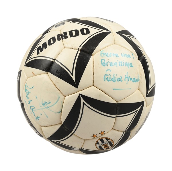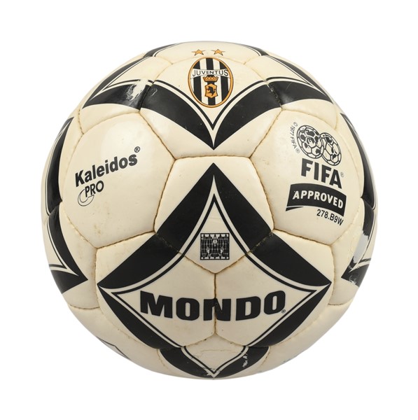 Juventus FC - Feyenoord Rotterdam. Pallone ufficiale utilizzato durante l'incontro del Gruppo E della Champions League, disputato in data 29 ottobre 2002 allo stadio Olimpico di Torino. Vittoria della Juventus per 2-0 con una doppietta di Di Vaio. Pallone Mondo Kaleidos PRO Juventus. Autografi ed annotazioni degli assistenti dell'arbitro presenti sul pallone. Official ball used during the Group E match of the Champions League, October 30, 2002 at the Olympic Stadium in Turin. 2-0 victory for Juventus with a double from Di Vaio. Mondo Kaleidos PRO Juventus ball. Autographs and annotations from assistant referees on the ball.