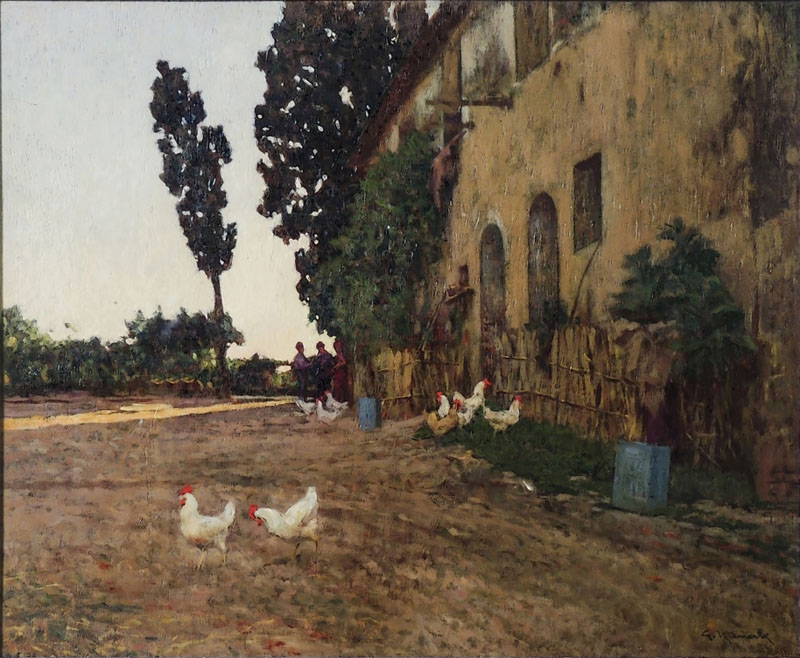 GIORGIO KIENERK (1879-1948) Casa di contadini (Fauglia) 1938 - Farmer House olio su tavoletta - oil on panel, firmato e datato 24.7.38, in cornice cm 50x60 Al verso reca timbro con iscrizione: G. Kienerk Firenze Elenco G. K. 539 ''Casa di contadini'' (Fauglia), timbro Galleria d'Arte San Barnaba - With inscription and stamps Bibliografia: E. Querci, Giorgio Kienerk 1869-1948, Allemandi, Torino: 2001, n 277 - Published work