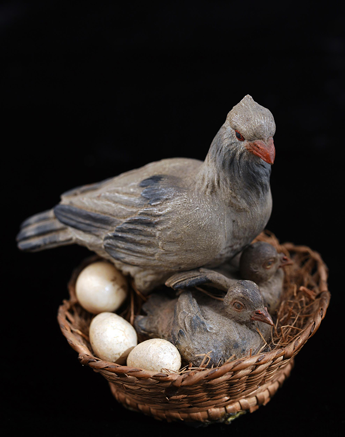 Cestino con tre colombi in legno policromo e tre uova in avorio attrib. F. Gallo h. cm 7x7 Provenienza: Coll. Mancini-Piscitelli, Napoli Bibliografia: AA.VV. Natività sulla scena barocca-Il presepe napoletano del settecento, MP Edizioni d’arte Napoli 1998, pag. 148 Napoli XVIII-XIX secolo