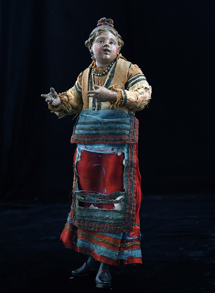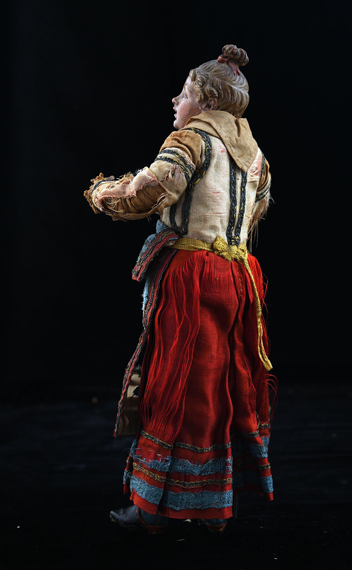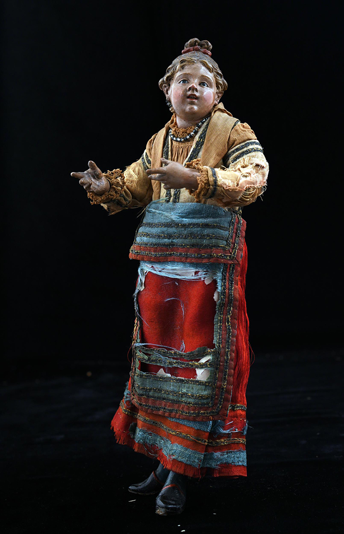 Ragazzina h cm 21 Napoli XVIII - XIX secolo Provenienza: Coll. Alicino, Roma; coll. privata, Roma Bibliografia: G. Noce Benigni Olivieri, Il pastore napoletano attraverso i secoli. Collezioni inedite, Voyage Pittoresque Napoli 2006 pag.34,36; G. Noce Benigni Olivieri, Il Presepe Napoletano del Settecento e la Pittura - La natura morta, De Luca ed. d'Arte, Roma 2013 pag. 53