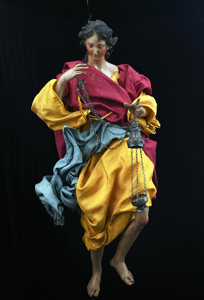 Angelo con turibolo h cm Napoli XVIII - XIX secolo Esposizioni: Gaeta, 2004-05 Bibliografia: Cat. Mostra Presepiale e di Arte Sacra, Cattedrale Gaeta 2004-2005, II edizione, in copertina e pag. 18; G. Noce Benigni Olivieri, Praesaepes Le vestiture nel presepe napoletano del settecento collezioni inedite, Voyage Pittoresque Napoli 2008 pag 30; G. Noce Benigni Olivieri, Il Presepe Napoletano del Settecento e la Pittura - La natura morta, De Luca ed. d'Arte, Roma 2013 pag. 18