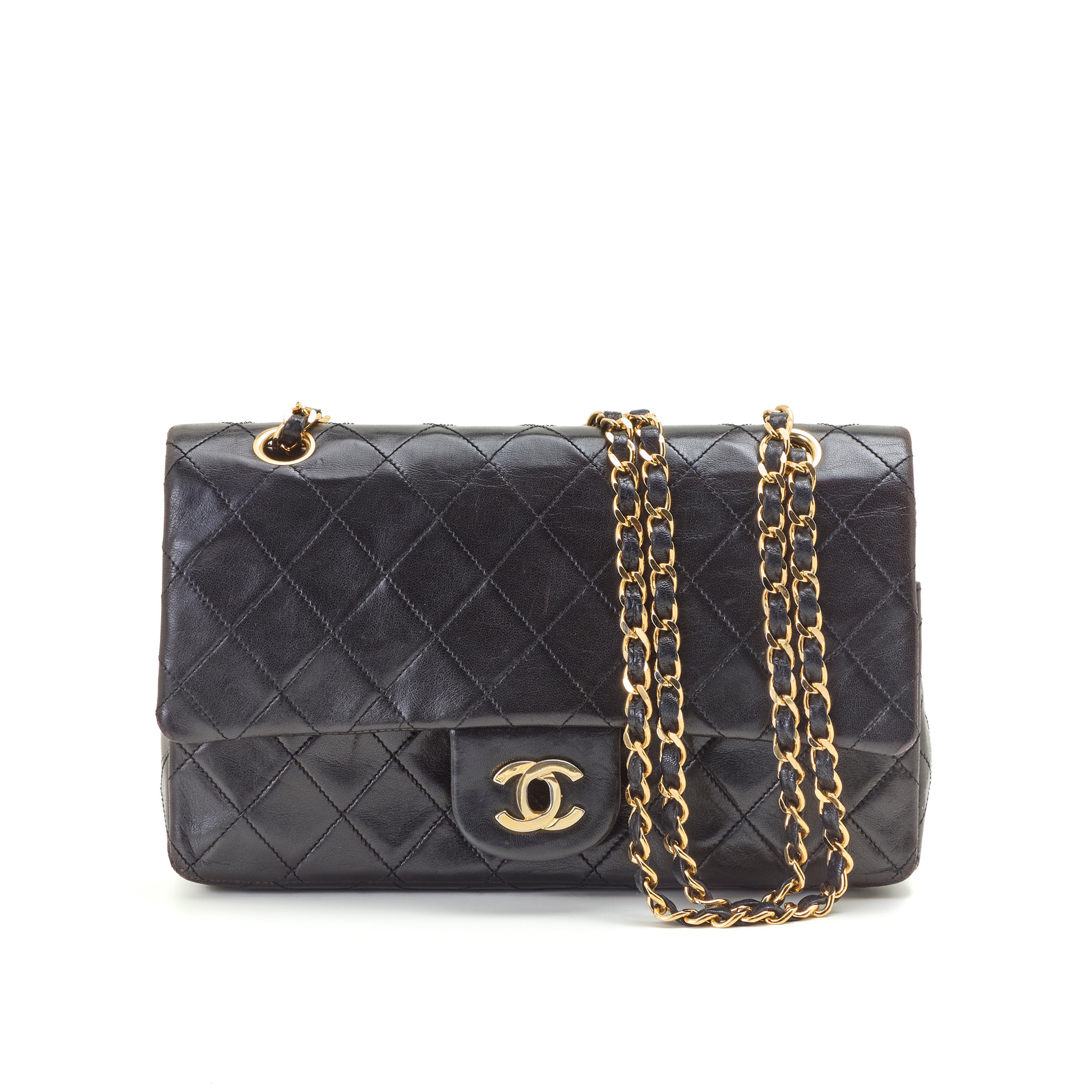 Borsa classica Chanel Timeless media in pelle d'agnello nera con metalleria dorata, doppia patta e interno in pelle bordeaux. Buone condizioni.