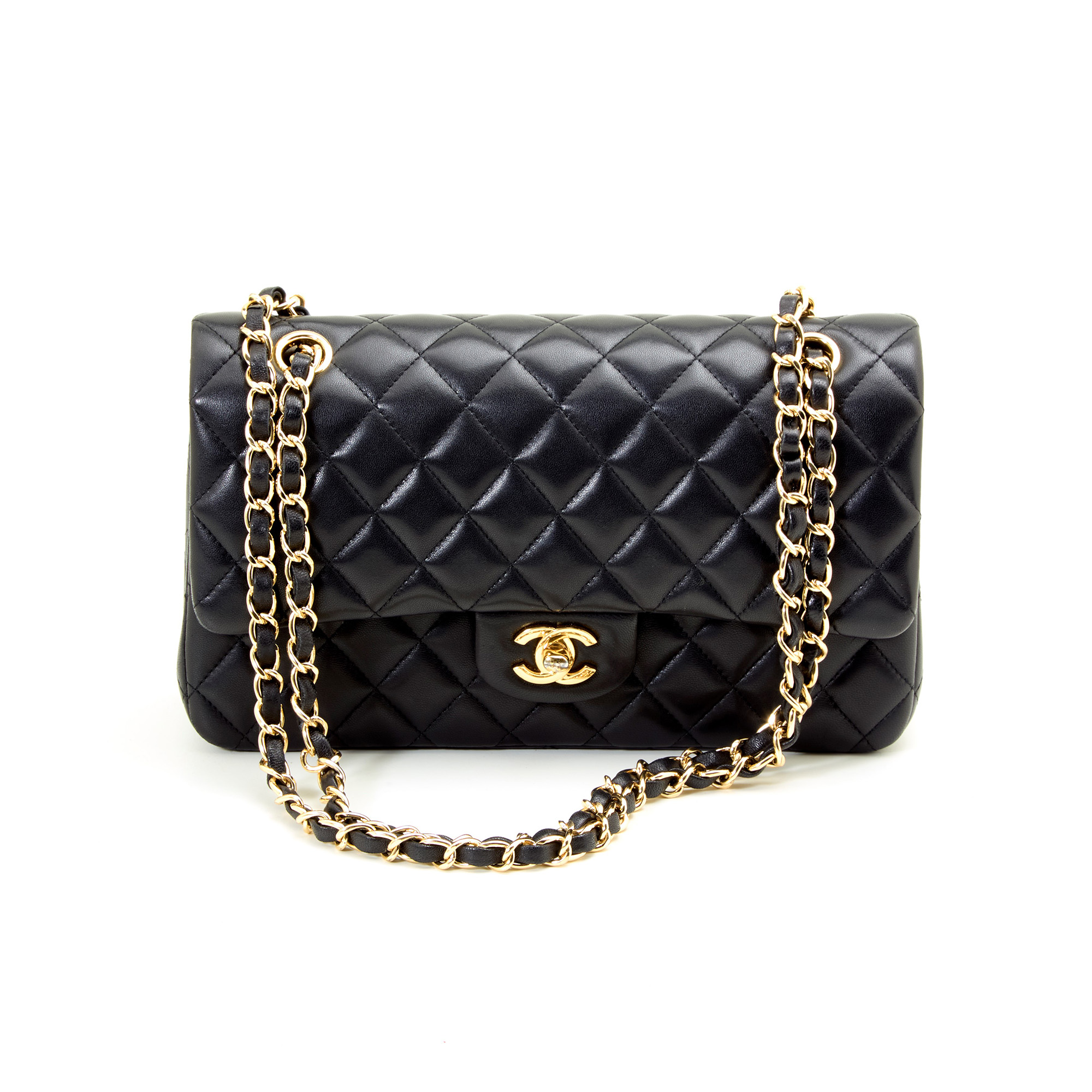 Borsa classica Chanel 11.12 media in pelle d'agnello nera con metalleria dorata, doppia patta e interno in pelle bordeaux, post 2021. Completa di dustbag, libretto per la cura dei materiali, panno per la manutenzione della metalleria, scatola e sacchetto originali. Condizioni molto buone.