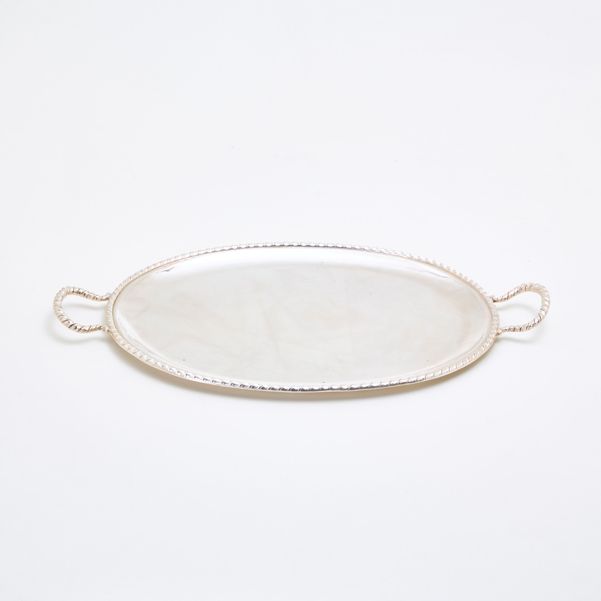 Vassoio in argento di forma ovale biansato con bordo tornito.