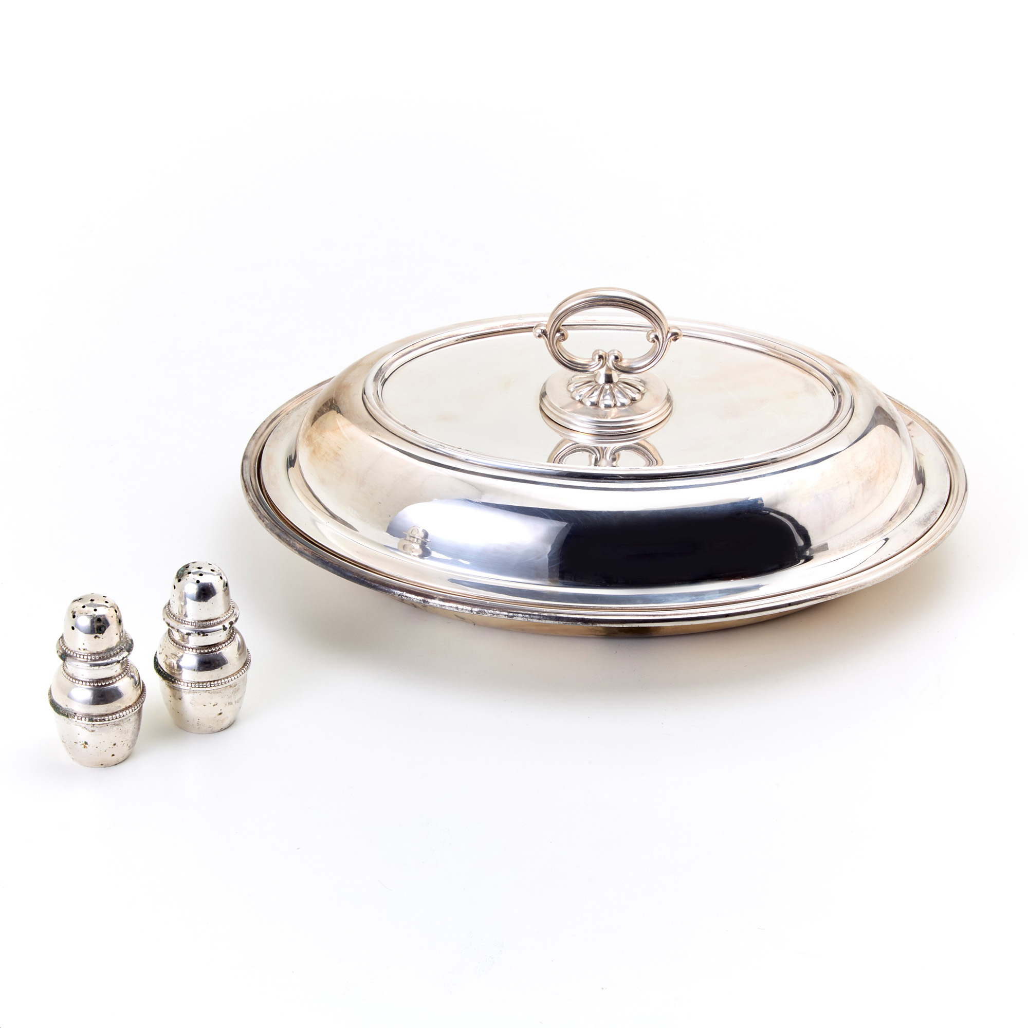 Lotto in argento composto da un portavivande ovale con coperchio e presa ad anello a tutto tondo e due saliere.