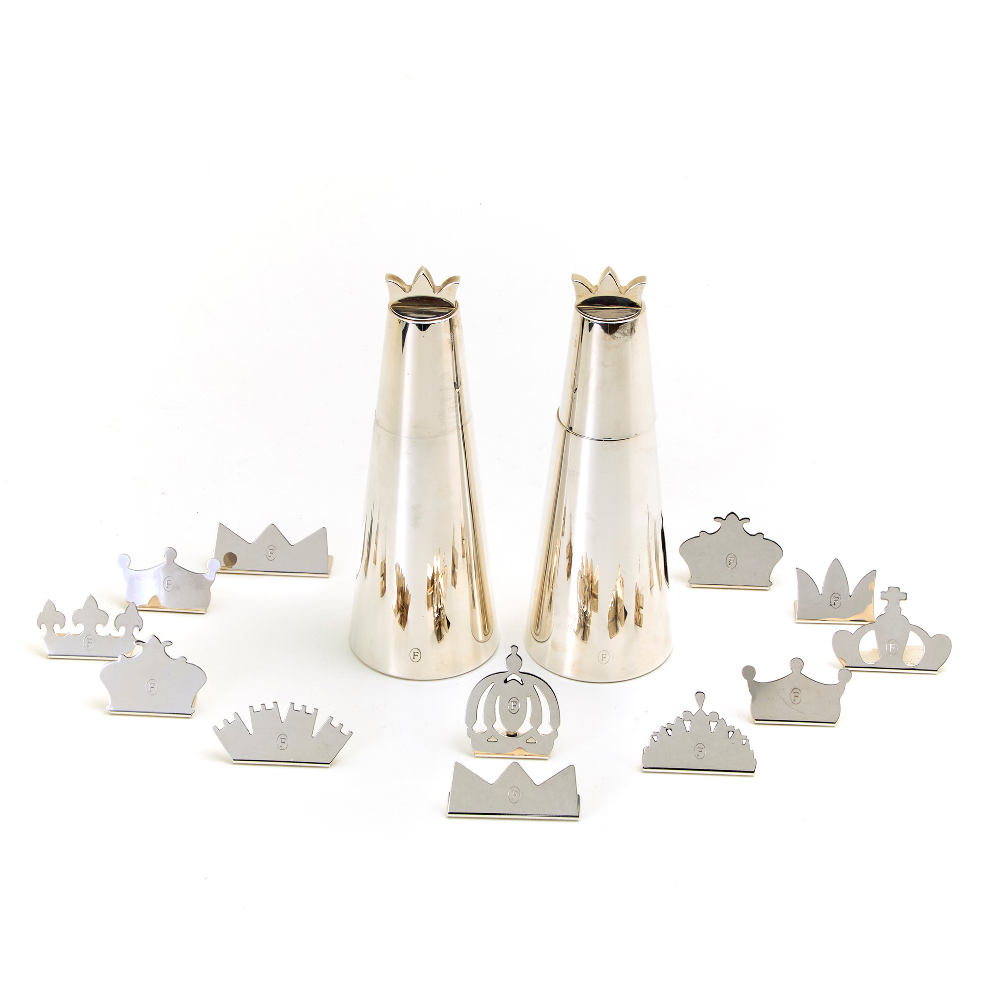 Lotto composto da dodici segnaposto, un macinasale e un macinapepe in argento Faraone decorati da corone.