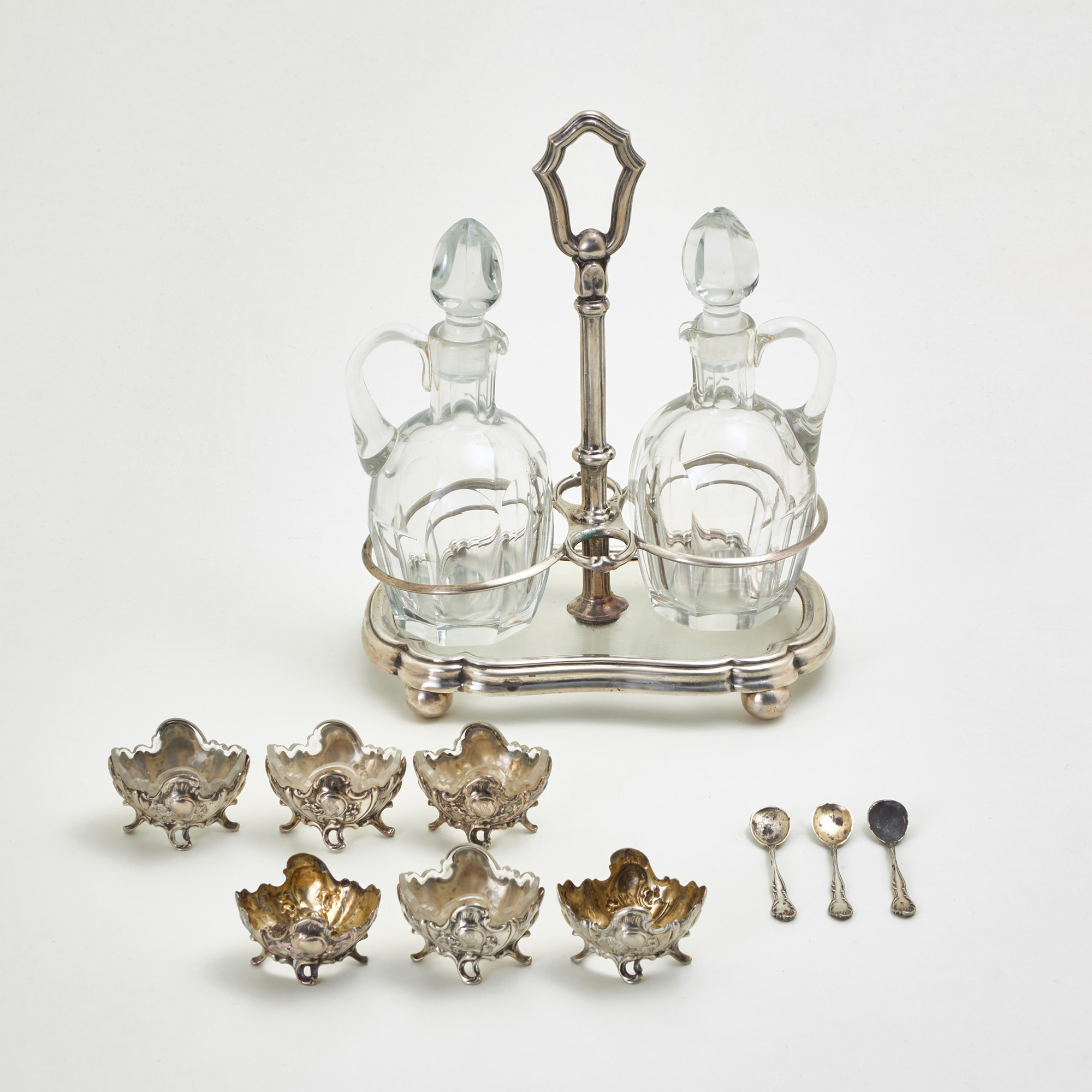 Silver lot consisting of a Cesa oil cruet with two glass cruets together with six salt cellars with glass cups and three small spoons.