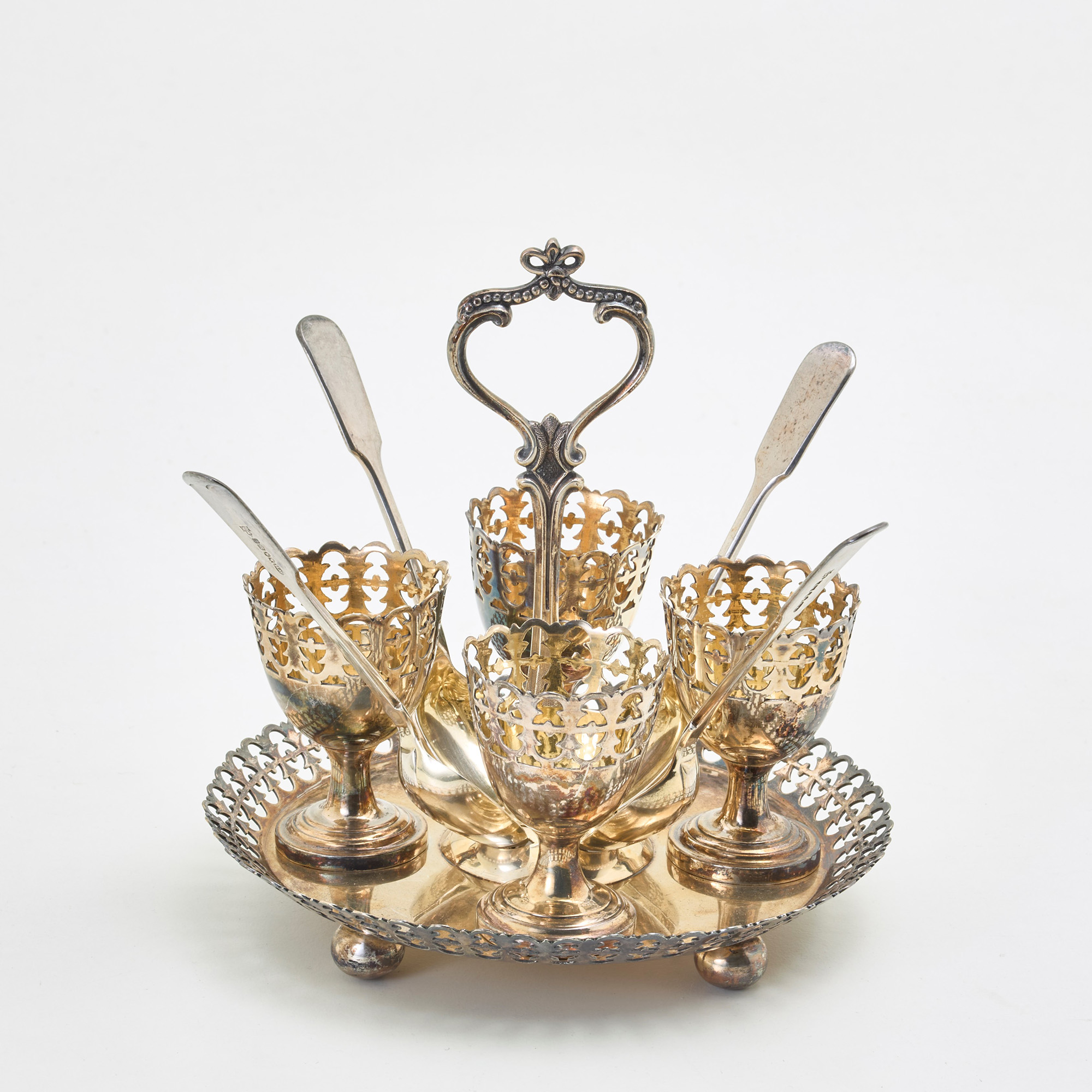 Egg cruet in argento con bordo traforato, superficie liscia, contenente quattro portauova e quattro cucchiaini non coevi e di diversa manifattura. Punzoni Sheffield 1863-1864. Corredato di scatola originale.Misure circa 15,5x15,5x17 cm