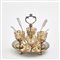 Egg cruet in argento con bordo traforato, superficie liscia, contenente quattro portauova e quattro cucchiaini non coevi e di diversa manifattura. Punzoni Sheffield 1863-1864. Corredato di scatola originale.Misure circa 15,5x15,5x17 cm