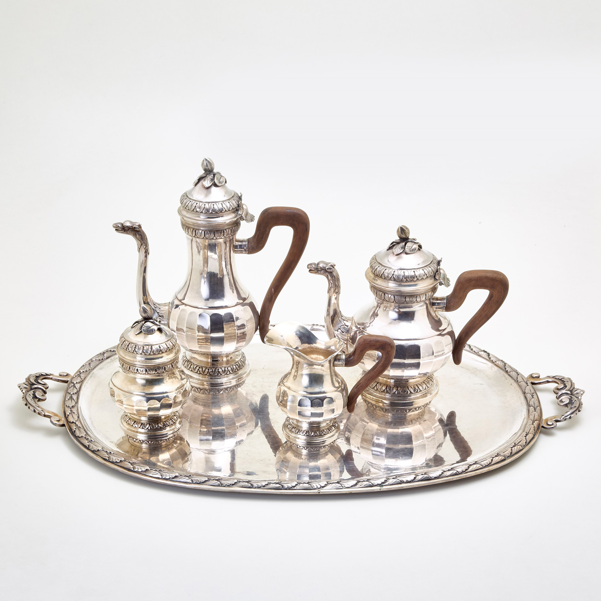 Servizio da tè e caffè in argento decorato da motivi vegetali, anse in legno, composto da: vassoio, teiera, caffettiera, lattiera e zuccheriera.