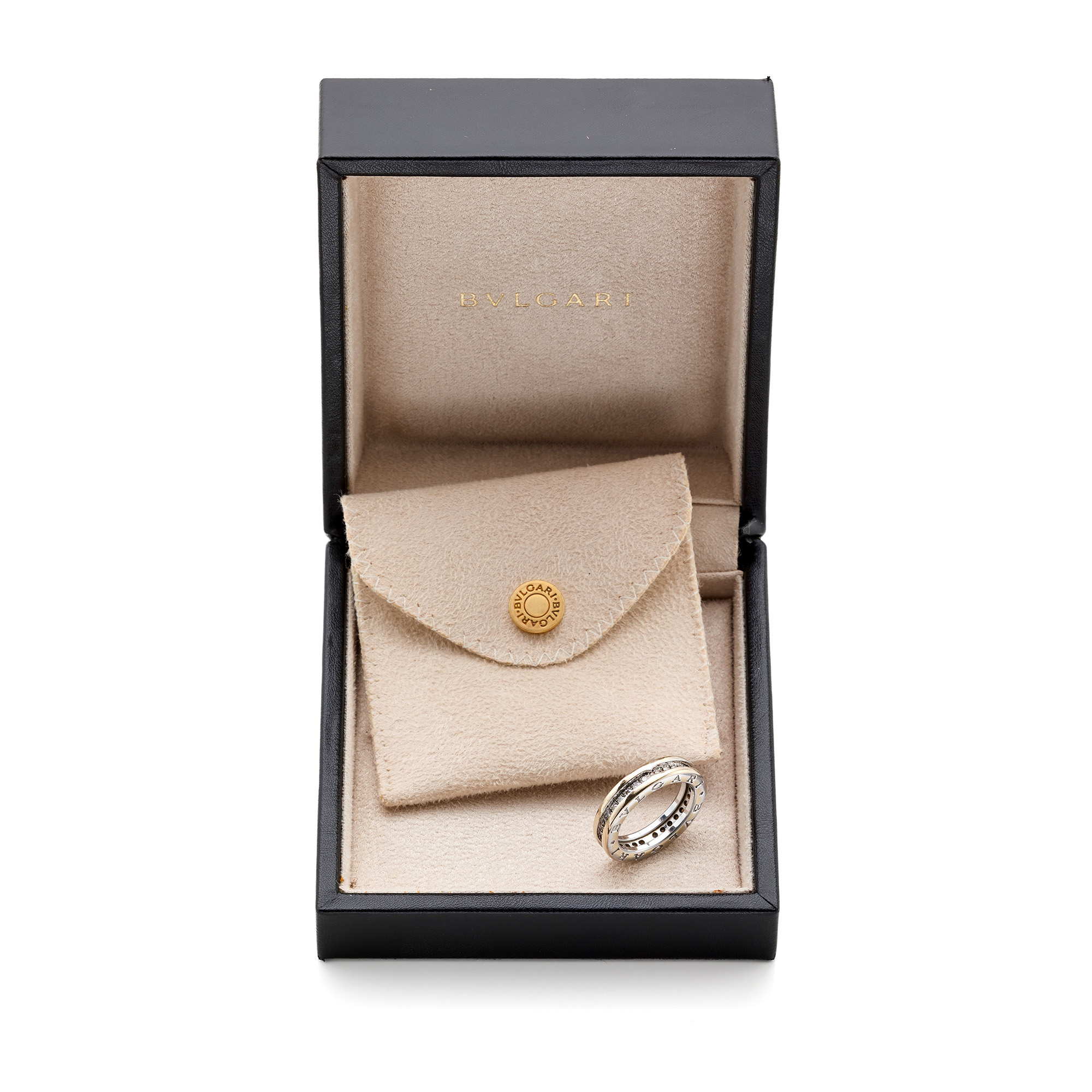 Anello Bulgari, collezione B.zero1 in oro bianco 18 Kt rifinito con diamanti rotondi per complessivi circa 0,30 ct. Corredato di scatola e astuccio originale.