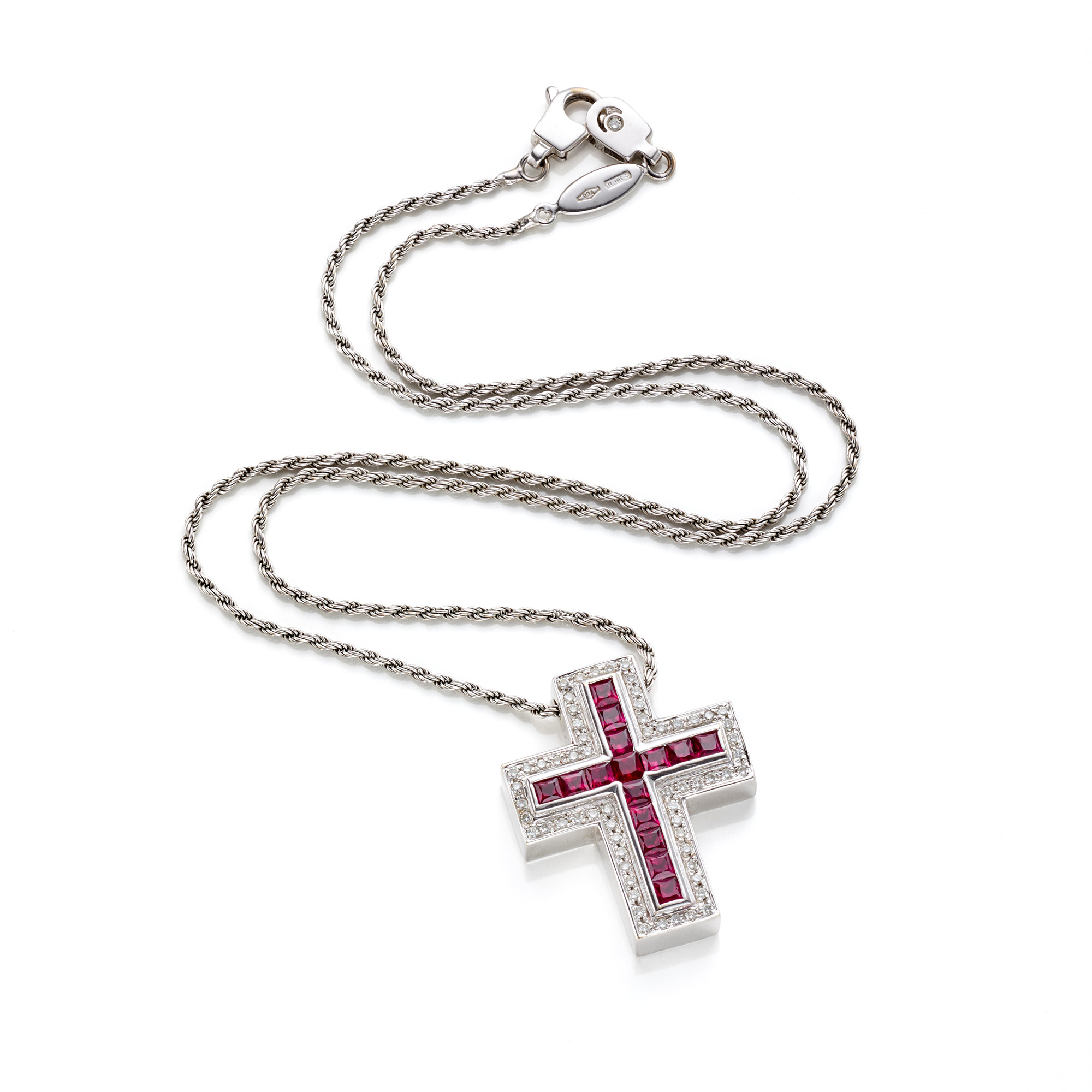 Salvini 18 Kt white gold cross pendant necklace with round diamonds totalling approx. 0,20 ct and carrè rubies.