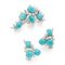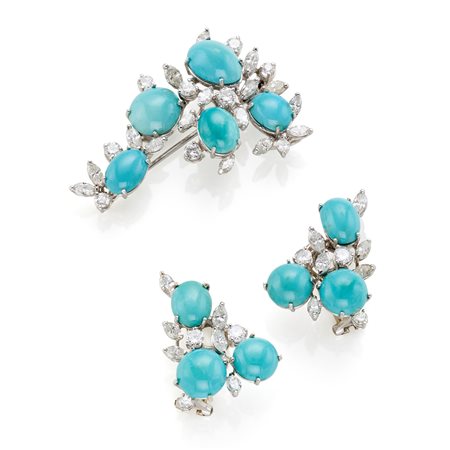 Demi parure composta da spilla ed orecchini in oro bianco 18 Kt con turchesi cabochon, diamanti rotondi e navette per complessivi circa 2,95 cm